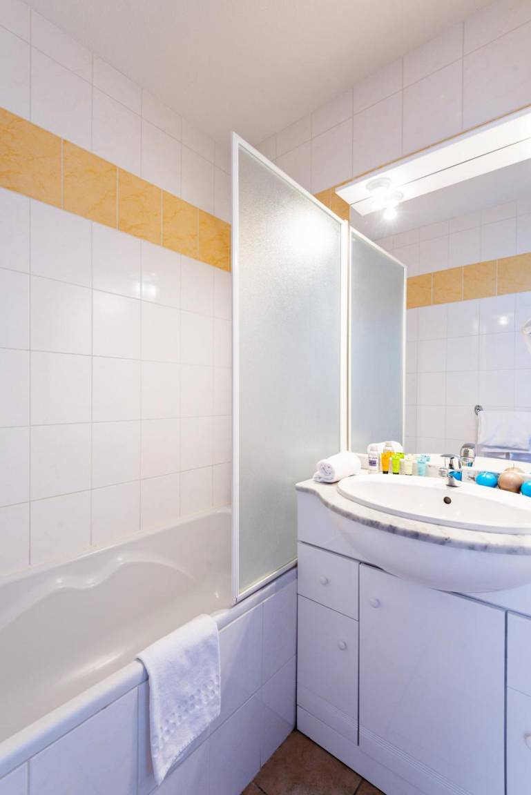 Fläche von ungefähr 54 m². Wohnzimmer mit Ausziehschlafcouch für 2 Personen. Schlafzimmer mit Doppelbett. Schlafzimmer mit 2 Einzelbetten. offener Schlafbereich mit 2 Stockbetten. Kochnische mit Kaffeemaschine, Geschirrspülmaschine, Mikrowellenherd, elektronische Herdplatten, Kühlschrank. Badezimmer mit Badewanne. WC. Badezimmer mit Dusche. Die oberen Betten sind nicht für Kinder unter 6 Jahren geeignet.