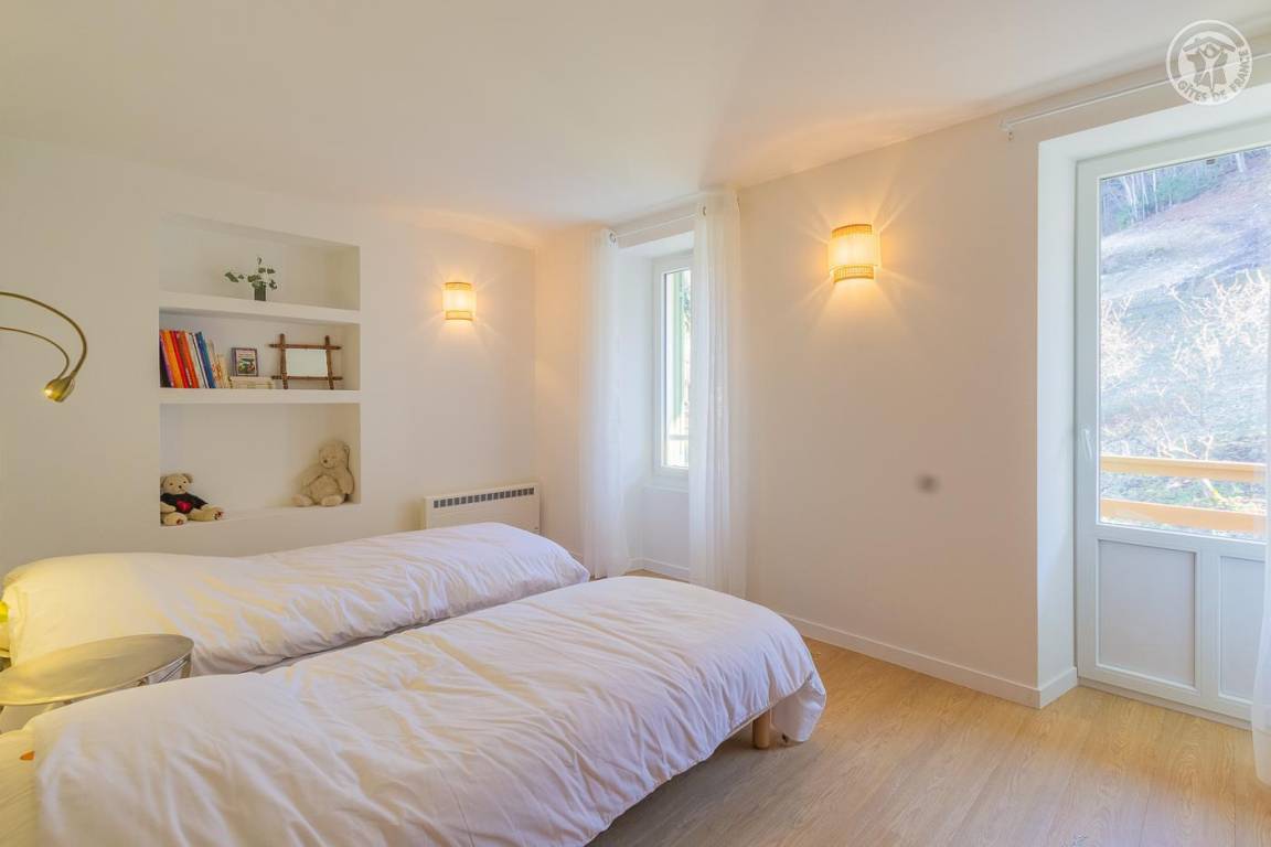 Gite auf 2 Ebenen, im Haus neben dem der Eigentümer. Hochparterre (ebener Zugang von der Straße) mit Wohnküche, Lounge mit Zugang zum Balkon und separatem WC (Waschbecken). 1. Etage: 2 Schlafzimmer mit Balkon (1 Doppelbett 140x190 cm / 2 Einzelbetten 80x190 cm), ein Badezimmer (Dusche und WC). Waschküche im Kellerkeller, mit Zugang von außen (Waschmaschine, Trockner, Gefrierschrank). Grundstück (Zugang über eine Treppe vom Balkon.