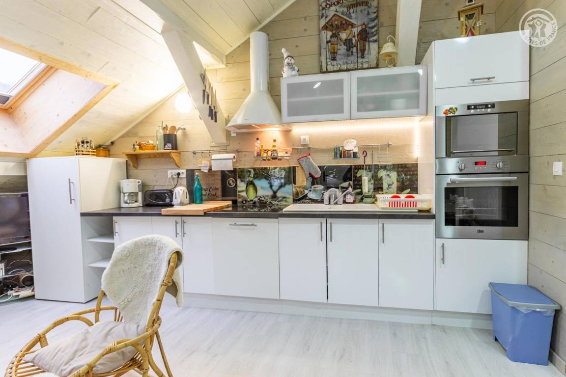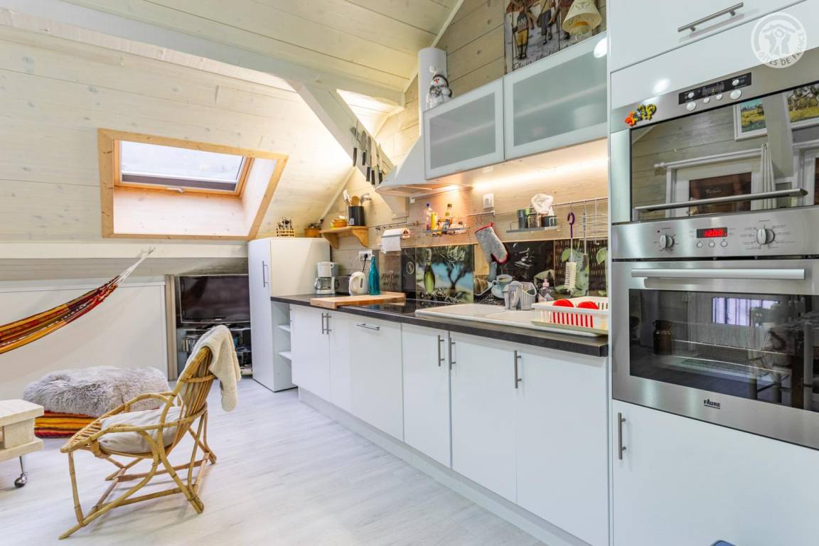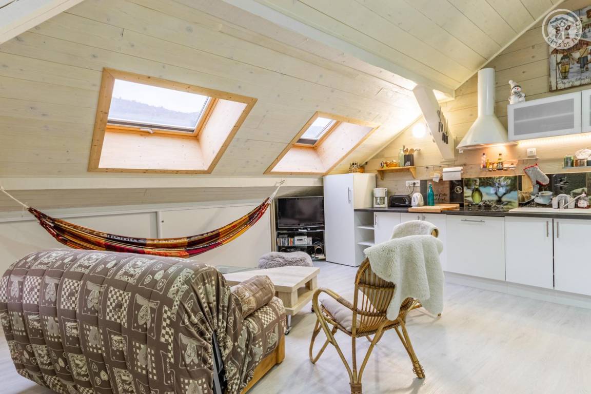 Zweistöckiges Ferienhaus mit separatem Außenzugang. Im Obergeschoss befinden sich ein Wohn-/Essbereich mit Schlafcouch für eine Person, ein kleines Dachgeschosszimmer (mit einem Doppelbett, 140 x 190 cm) und ein Duschbad mit Dusche und WC. Im Erdgeschoss (nur von außen zugänglich) befinden sich ein Schlafzimmer mit Fernseher (mit einem Doppelbett, 140 x 190 cm), ein Duschbad und ein separates WC. Zwei Balkone. Der mit den Eigentümern gemeinsam genutzte Gewölbekeller mit separatem Außenzugang bietet eine Waschmaschine und einen Trockner, einen Skischrank und einen Fahrradabstellplatz. Öffentliche Parkplätze befinden sich 50 Meter vom Haus entfernt.