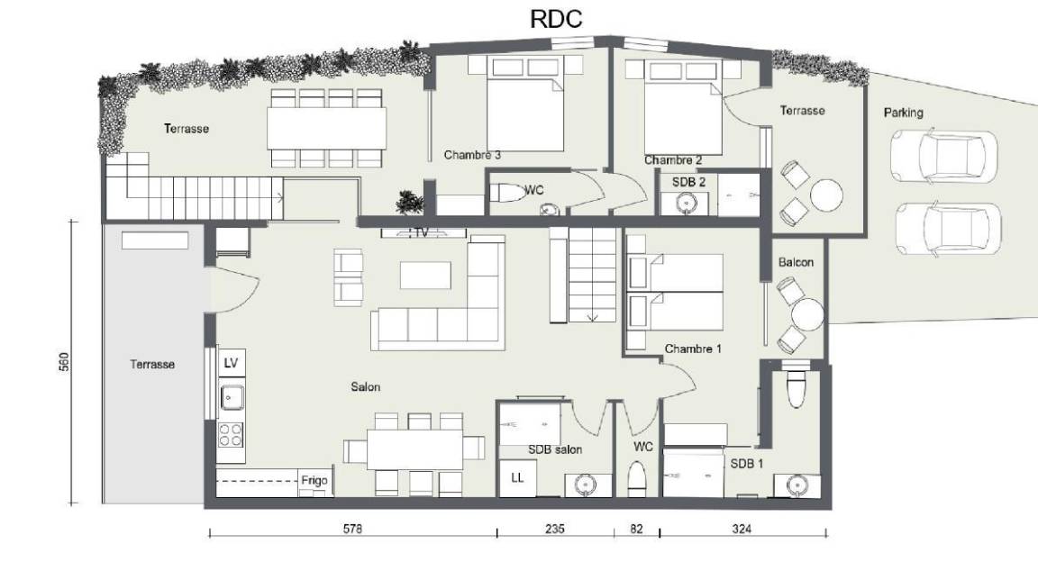 Gîte in einer Wohnanlage mit zwei weiteren Gîtes. Im Erdgeschoss, Zugang über 3 Stufen. Wohnzimmer-Küche (1 Schlafsofa für 2 Personen 140 x 190 cm), Badezimmer (Badewanne), WC, 2 Schlafzimmer (1 Doppelbett 140 x 190 / 2 Einzelbetten 80 x 190 cm und 1 Einzelbett 90 x 190 cm). Abstellraum für Ski und Fahrräder im Keller. Terrasse. Privatparkplatz (1 Platz) im Untergeschoss geschlossen.