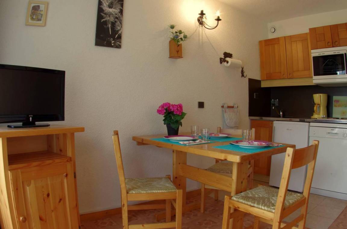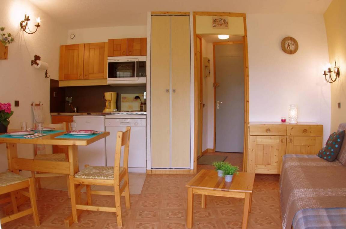Die Residenz Le Cristallin befindet sich im Stadtteil Mottet im Ferienort Valmorel. Sie ist durch Télébourg (eine kleine Gondelbahn, die den Berg und den Fuß des Ferienorts verbindet) mit dem Zentrum verbunden. Geschäfte liegen 300 m vom Gebäude entfernt. Fläche von ungefähr 18 m². Orientierung : Nord, West. Blick skipisten und Berg. Diele mit Schrank. Wohnzimmer mit Ausziehschlafcouch für 2 Personen. Kochnische mit Kaffeemaschine, Backofen, Geschirrspülmaschine, 2 Herdplatten, Kühlschrank. Badezimmer mit Badewanne, WC. Terrasse.