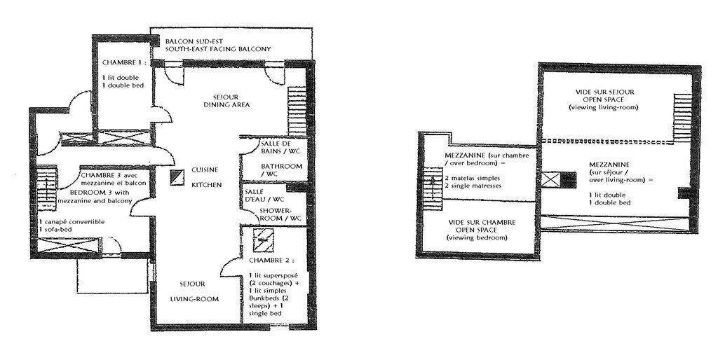 Die Residenz Le Bourg Morel befindet sich im Herzen des Ferienortes Valmorel. Sie wohnen in unmittelbarer Nähe der Geschäfte und Restaurants. Sie können die Unterhaltungs- und Aktivitätsangebote des Ferienortes neben der Residenz nutzen. Fläche von ungefähr 73 m² enthält 28 m² unter 1,80 m. 2te Etage. Orientierung : Ost, Süd. Blick berg. Wohnzimmer. Zwischengeschoss mit Doppelbett. Schlafzimmer mit Doppelbett. Schlafzimmer mit Einzelbett, 2 Stockbetten. Zwischengeschoss mit Klappschlafcouch, 2 Matratzen. offene Küche mit Wasserkocher, Kaffeemaschine, Backofen, Toaster, Geschirrspülmaschine, 2 Herdplatten, Kühlschrank. Badezimmer mit WC. Waschräume mit WC. Balkon. Die oberen Betten sind nicht für Kinder unter 6 Jahren geeignet.