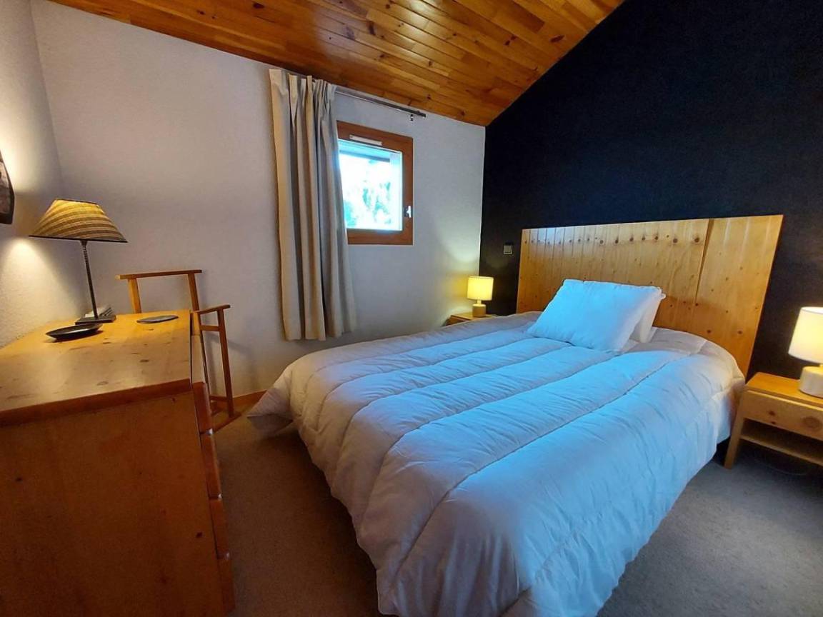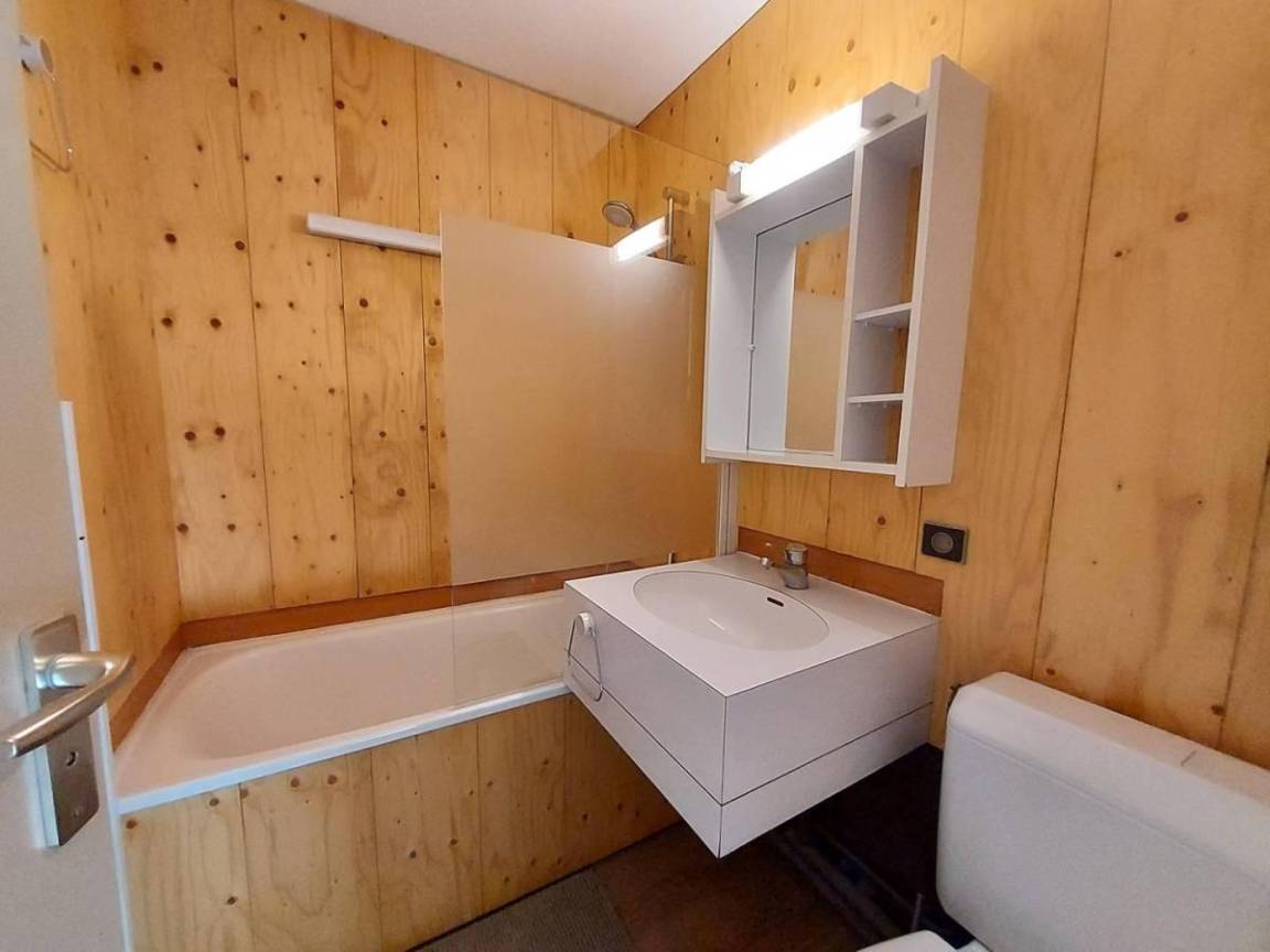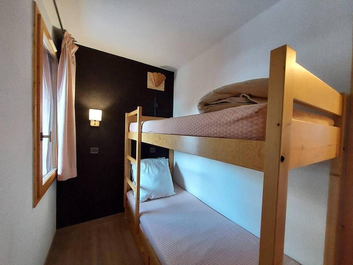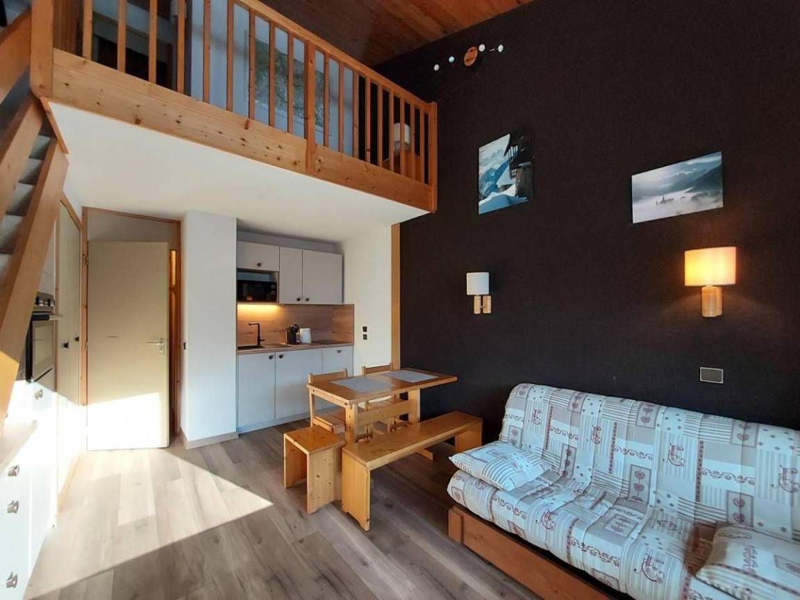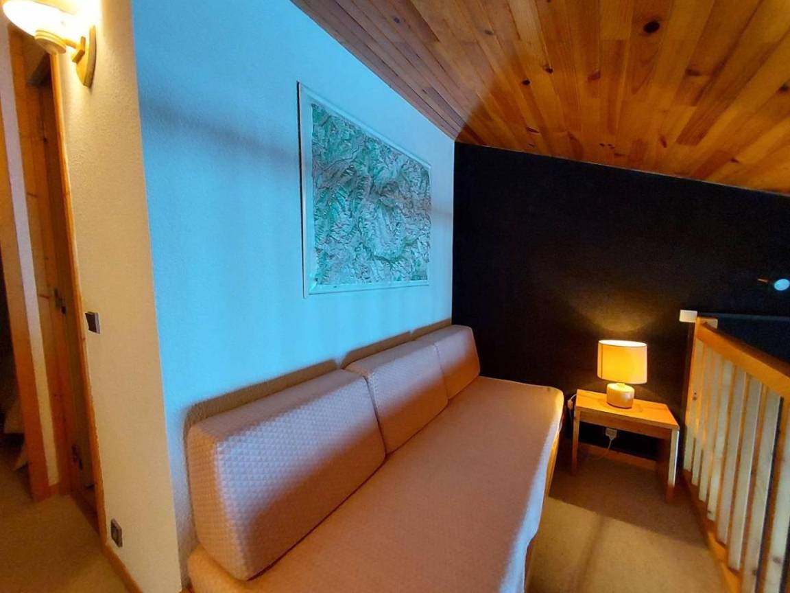 Fläche von ungefähr 38 m². 7te Etage. Orientierung : Süd-West. Niveau 0 : Wohnzimmer mit TV. Schlafzimmer mit 2 Stockbetten (80). Kochnische mit Kaffeemaschine, Backofen, , Waschmaschine, Geschirrspülmaschine, Mikrowellenherd, 2 Induktionsherdplatten, Kühlschrank. Badezimmer mit WC. Balkon. Waschmaschine. Niveau 1 : Zwischengeschoss mit einfache Klappschlafcouch (80). Schlafzimmer mit Doppelbett (140). Waschräume mit WC. Die oberen Betten sind nicht für Kinder unter 6 Jahren geeignet.
