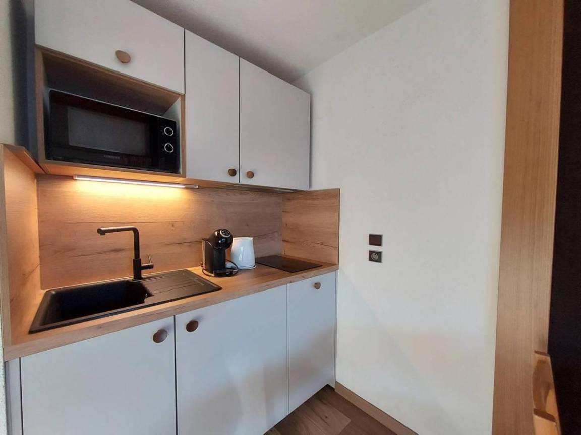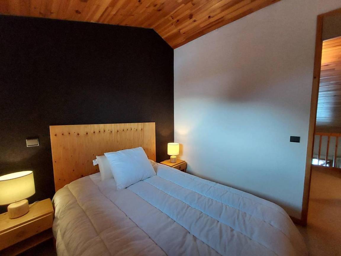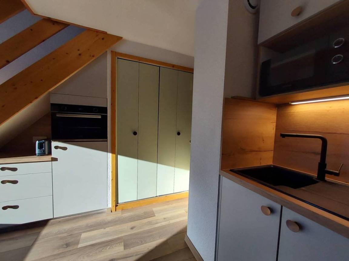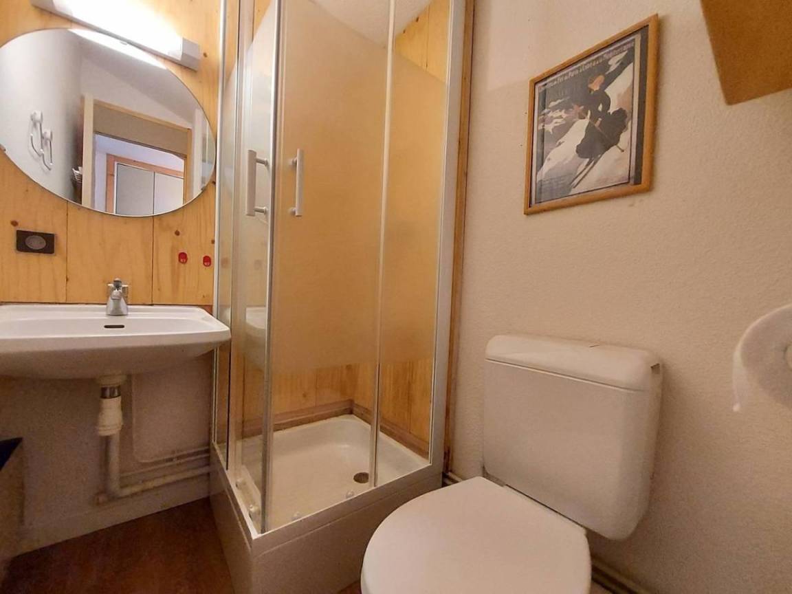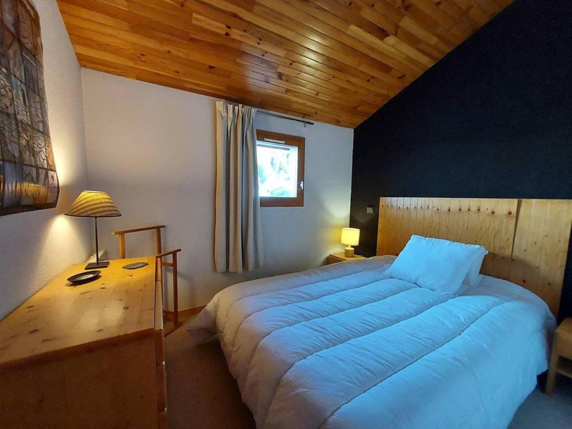 Fläche von ungefähr 38 m². 7te Etage. Orientierung : Süd-West. Niveau 0 : Wohnzimmer mit TV. Schlafzimmer mit 2 Stockbetten (80). Kochnische mit Kaffeemaschine, Backofen, , Waschmaschine, Geschirrspülmaschine, Mikrowellenherd, 2 Induktionsherdplatten, Kühlschrank. Badezimmer mit WC. Balkon. Waschmaschine. Niveau 1 : Zwischengeschoss mit einfache Klappschlafcouch (80). Schlafzimmer mit Doppelbett (140). Waschräume mit WC. Die oberen Betten sind nicht für Kinder unter 6 Jahren geeignet.