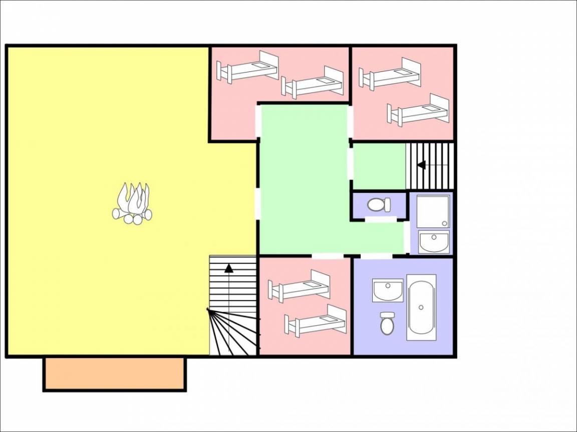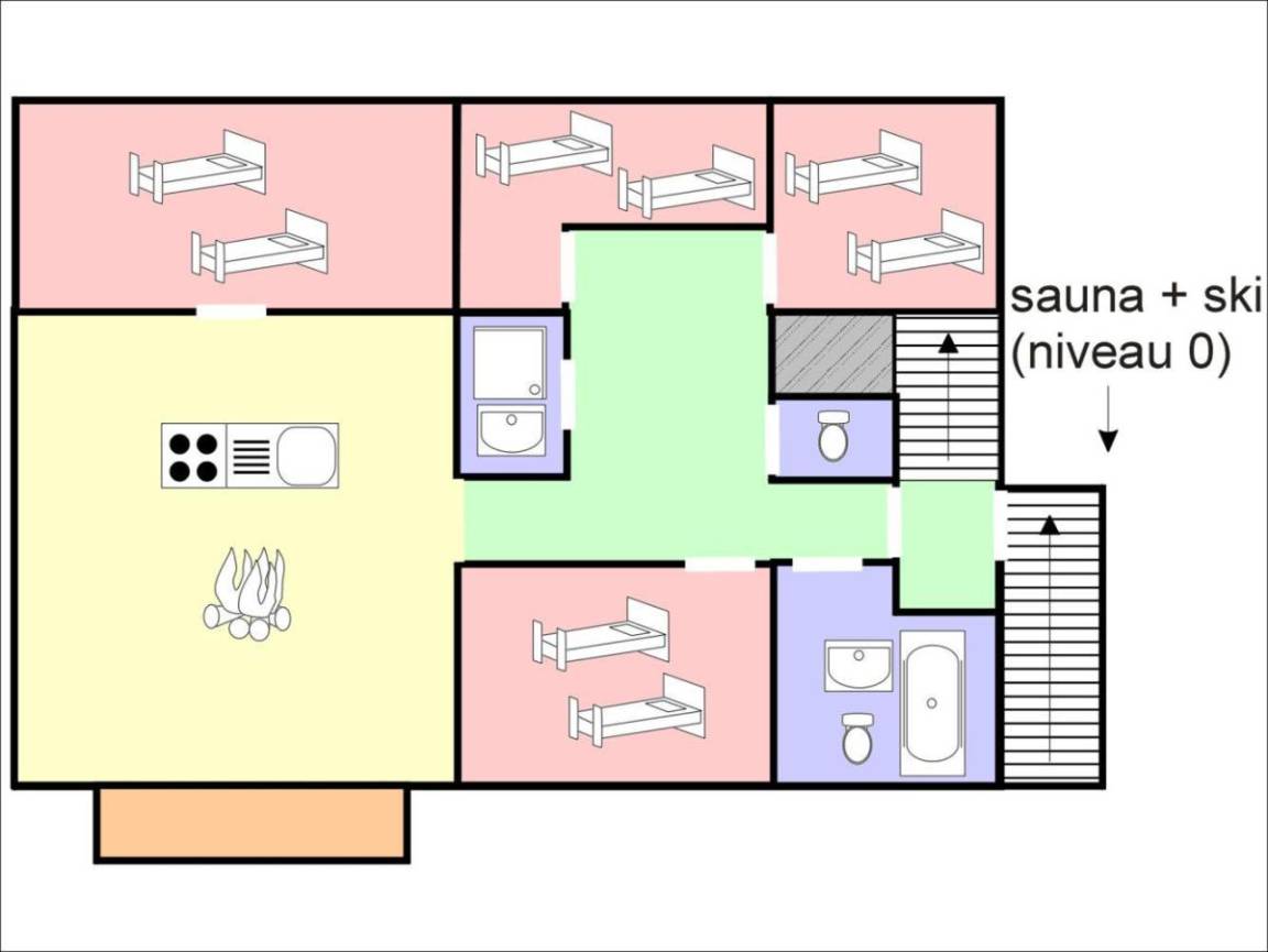 Fläche von ungefähr 260 m². Wohnzimmer mit 2 Kamine, Einzelbett. Esszimmer. 2 Schlafzimmer mit 3 Einzelbetten. 8 Schlafzimmer mit 2 Einzelbetten. Zwischengeschoss mit Klappschlafcouch für 1 Person. offene Küche mit Fonduegerät, Raclettegerät, Wasserkocher, Kaffeemaschine, Backofen, Geschirrspülmaschine, Mikrowellenherd, Mixer, Gasherdplatten, 2 Kühl-und Gefrierschränke. 4 Waschräume mit Dusche, Waschbecken. Badezimmer mit Badewanne, Waschbecken, WC. Badezimmer mit Badewanne, Waschbecken, Waschmaschine, WC. 3 separate WCs. Balkon.