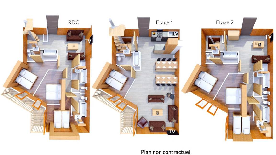 Angesiedelt auf der Piste "plein sud" mit freiem Blick auf das Tal von Belleville empfängt sie Les Balcons de Val Thorens**** in den französischen Alpen in entspannter Atmosphäre und mit seinen hochqualitativen Appartements. Erholen Sie sich in der gemütlichen und harmonischen Atmosphäre der geräumigen wie auch komfortablen Appartements. Lassen Sie sich von dem Holzdekor, den savoyischen Möbeln und den sonnenbeschienenen Balkons verzaubern. Nach einem Tag auf Skiern wärmen Sie sich im gemütlichen Salon bei den Flammen des Holzofens auf (ab Typ 6/9 und höher) und nutzen Sie die Whirlpool-Badewanne für größtes Wohlbefinden. Fläche von ungefähr 190 m². Einige als Maisonette. Niveau 0 : 3 Schlafzimmer mit Badewanne mit Whirlpoolfunktion, 2 zwei Einzelbetten, Badezimmer, WC. Balkon. Niveau 1 : Wohnzimmer mit Ausziehschlafcouch für 2 Personen, . Schlafzimmer mit Badewanne mit Whirlpoolfunktion, 2 zwei Einzelbetten, Badezimmer, WC. Küche mit Wasserkocher, Kaffeemaschine (filtre), Backofen, Toaster, Geschirrspülmaschine, Mikrowellenherd, Glaskeramikkochfelder, Kühl-Gefrier-Kombination. Balkon. Niveau 2 : 3 Schlafzimmer mit Badewanne mit Whirlpoolfunktion, 2 zwei Einzelbetten, Badezimmer, WC.
