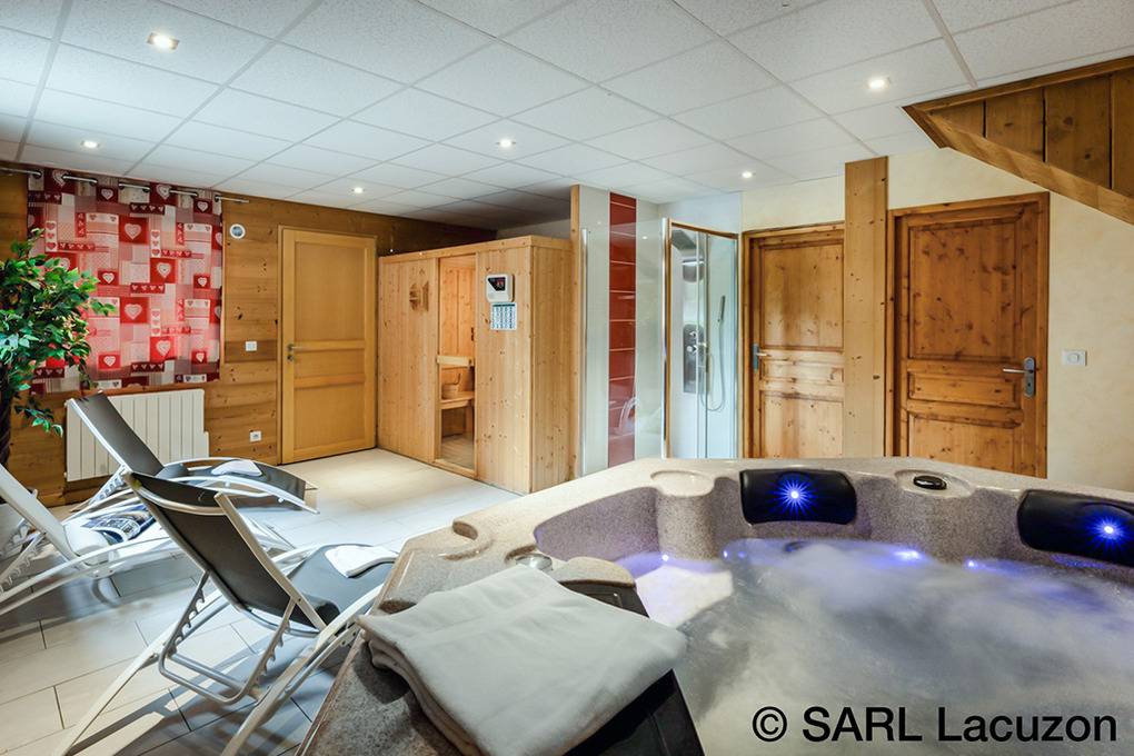 Erdgeschoss: Vierbettzimmer mit Bad/WC. Skiraum. Wellnessraum mit Sauna, Whirlpool, Dusche.