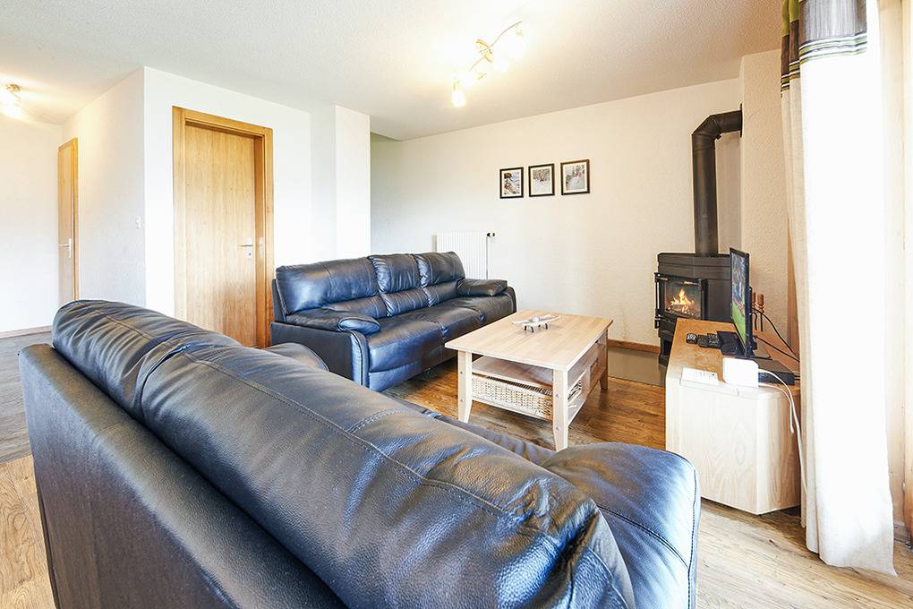 Parterre: Wohnraum (30 qm) mit gemütlicher Sitzgruppe am Kaminofen, Kabel-TV, DVD, Esstisch, Einbauküche (Backofen, Mikrowelle, Spülmaschine), Terrasse (schöner Panaromablick, Sitzmöbel). 2-Bettzimmer. Bad: Du, Wb, WC.
