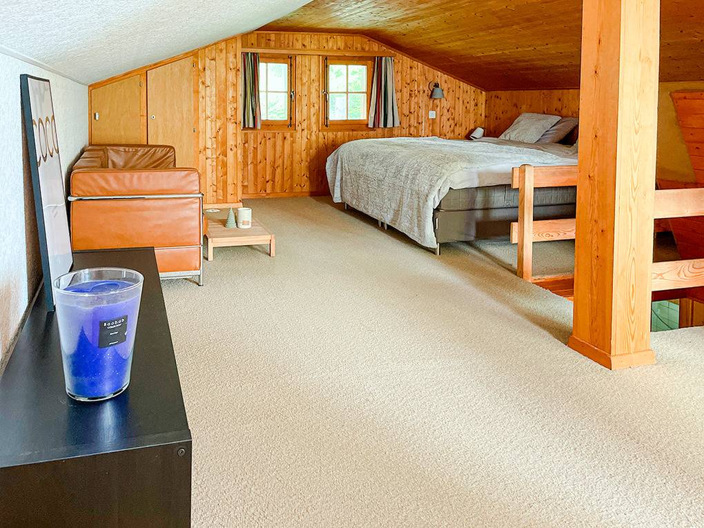 Dachgeschoss mit Schrägen (Stehhöhe max. 1,75 m): Schöner Wohn-/Schlafraum mit Doppelbett, Sofa-Sitzgruppe. Angrenzend kleiner Ruhe- und Arbeitsbereich vor großen Panoramafenstern (Sessel, und Schreibtisch).