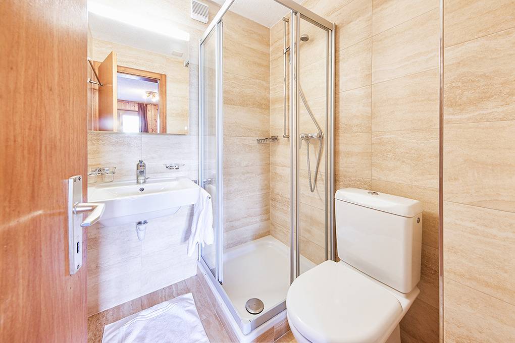 1. Etage (Hanglage): Haupteingang, Flur mit Garderobe. Zwei Doppelzimmer mit Balkon. 2-Bettzimmer. Bad: Bw/Du, Wb, WC.