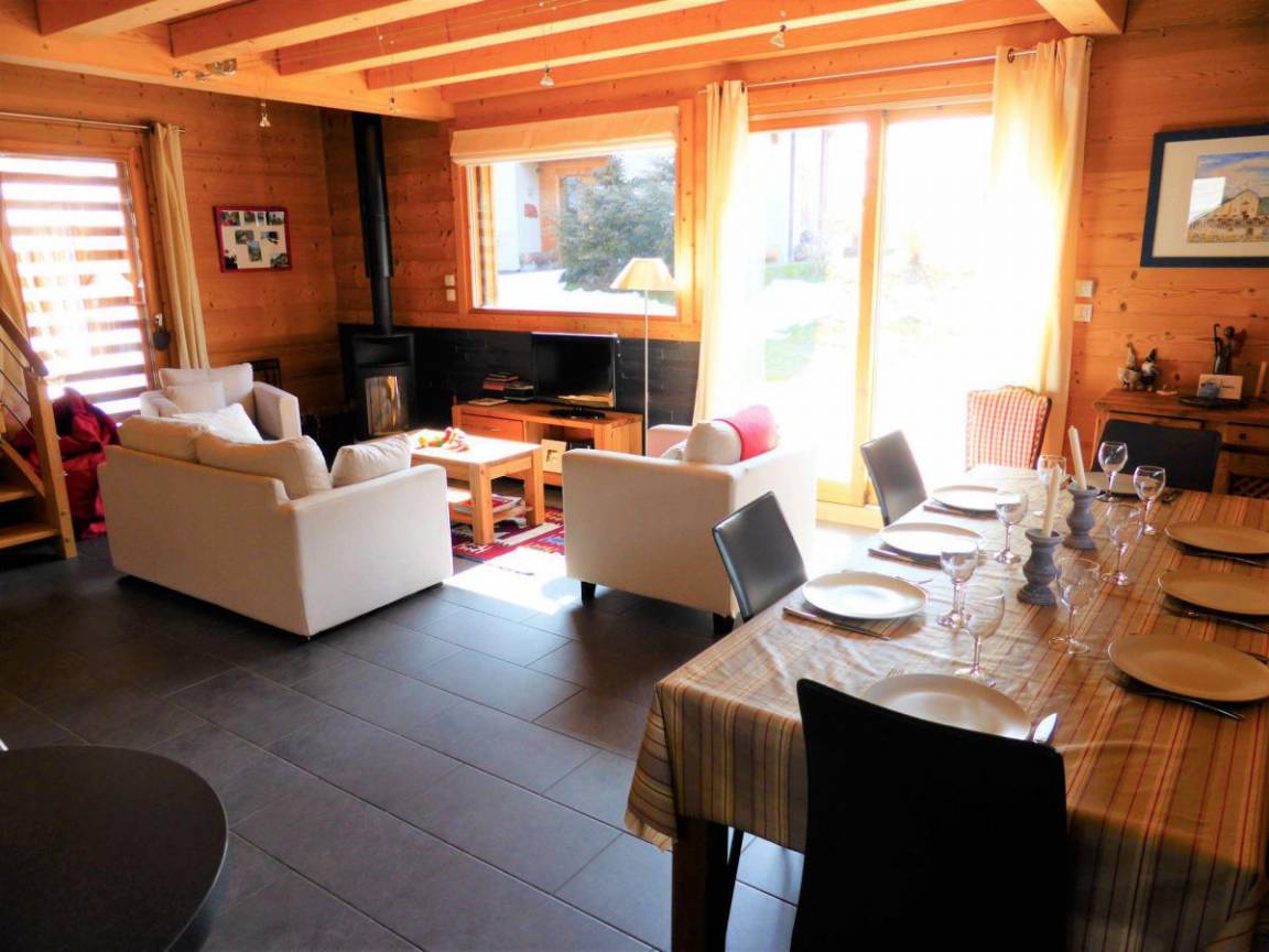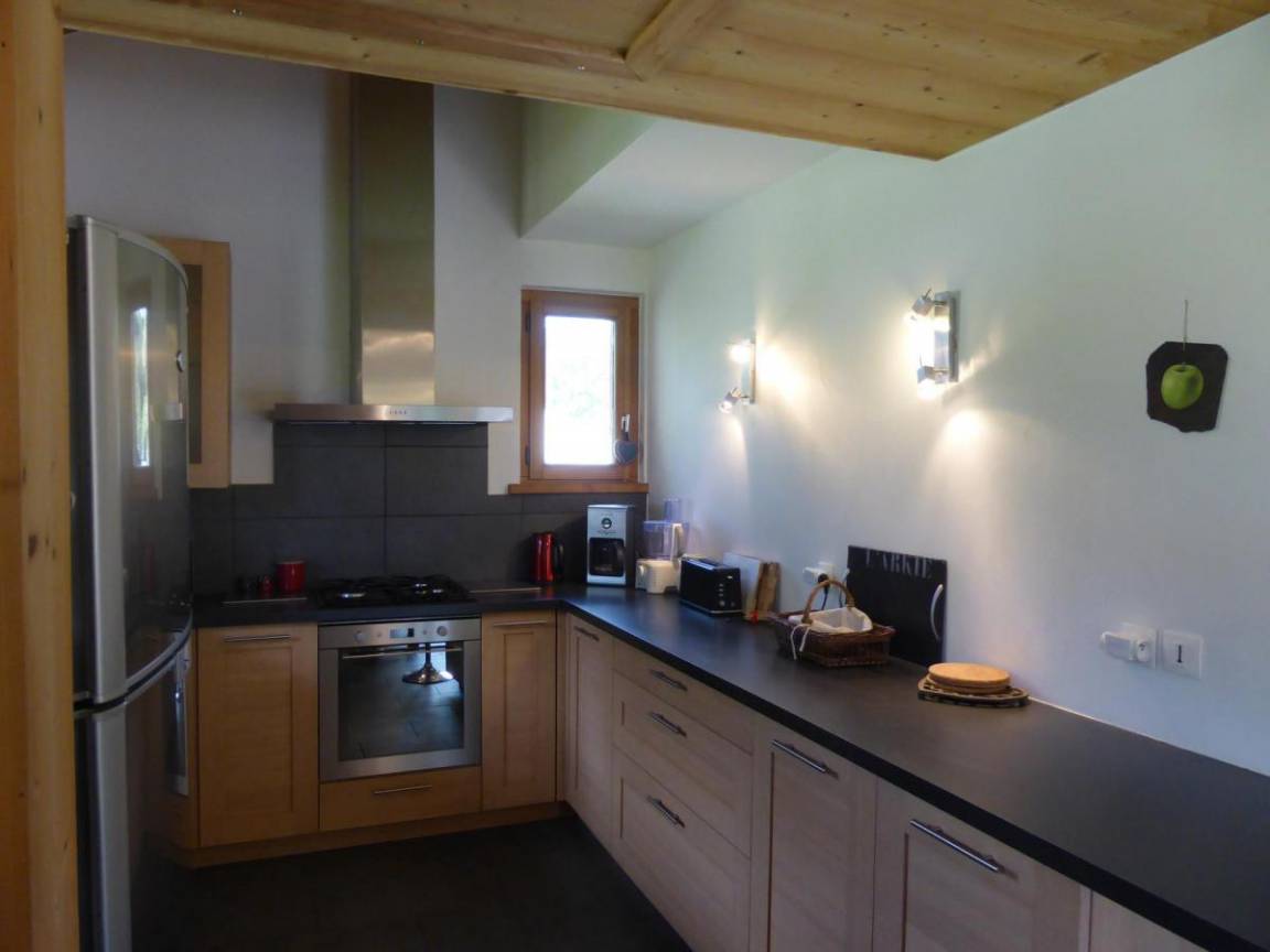 Fläche von ungefähr 120 m². Erdgeschoss. Orientierung : Süd. Blick berg (Glacier de Miage). Niveau 0 : Schlafzimmer mit Doppelbett (140x190). Küche mit Fonduegerät, Kaffeemaschine, Backofen, Geschirrspülmaschine, Mikrowellenherd, Mixer, 4 elektronische Herdplatten, Kühl-Gefrier-Kombination. Niveau 1 : Wohnzimmer mit Schwedenofen. Schlafzimmer mit Doppelbett. Waschküche mit Waschmaschine, Wäschetrockner. Badezimmer mit Badewanne. separates WC. Niveau 2 : 2 Schlafzimmer mit 2 Einzelbetten. Badezimmer mit Dusche, WC.