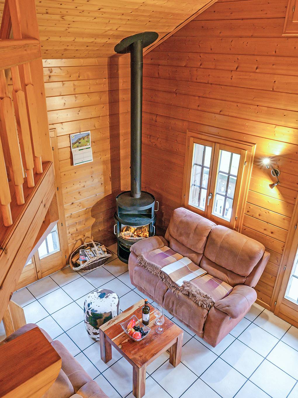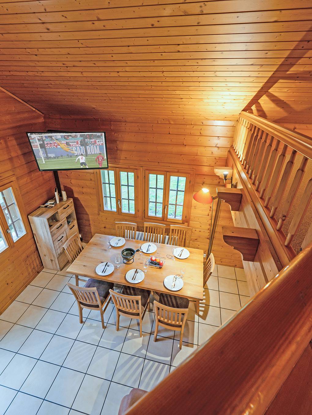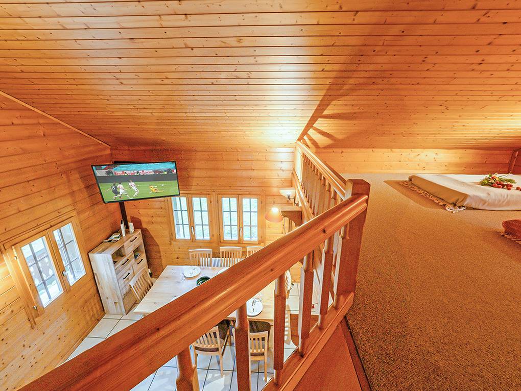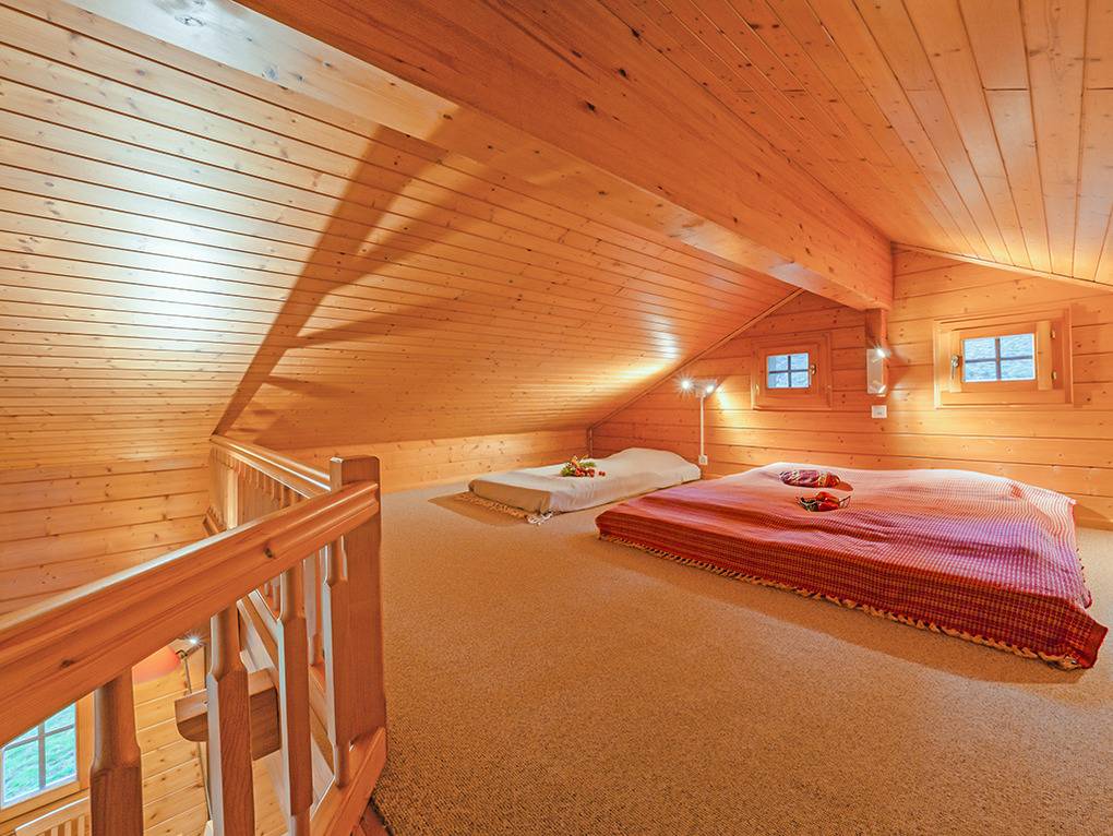 1. Etage: Geräumiger Wohnraum (40 qm), ausgebaut bis zum Dachgiebel, mit Schwedenofen, Sitzgruppe, TV, Esstisch, thekenartig abgetrennter Küche (Backofen). Separates WC. Vom Wohnraum aus Treppe auf offene Galerie mit 4 Einzelmatratzen unter starker Dachschräge.