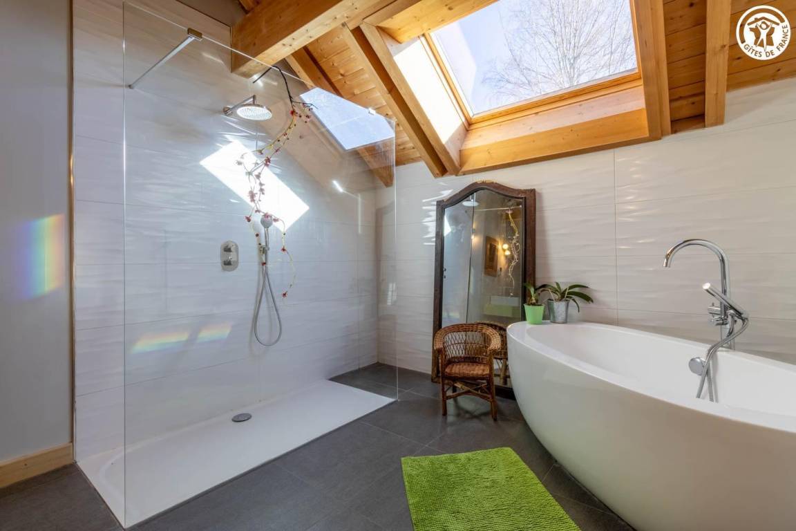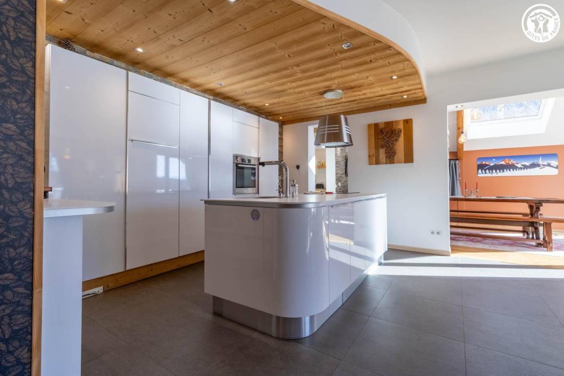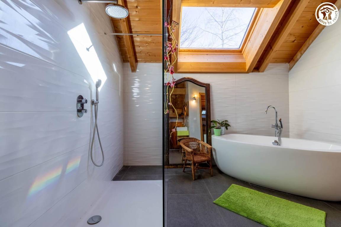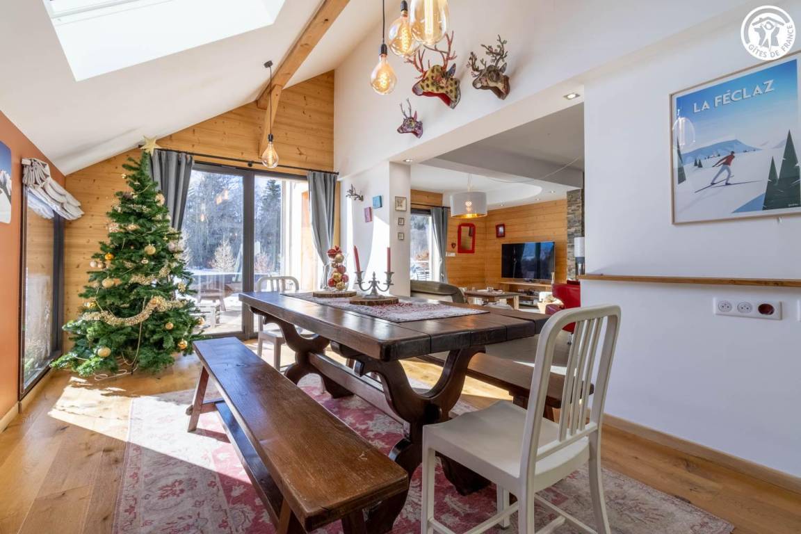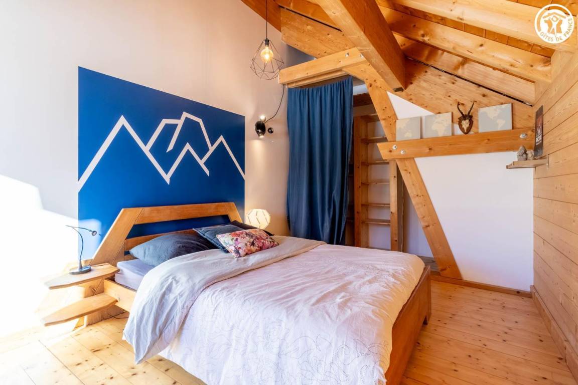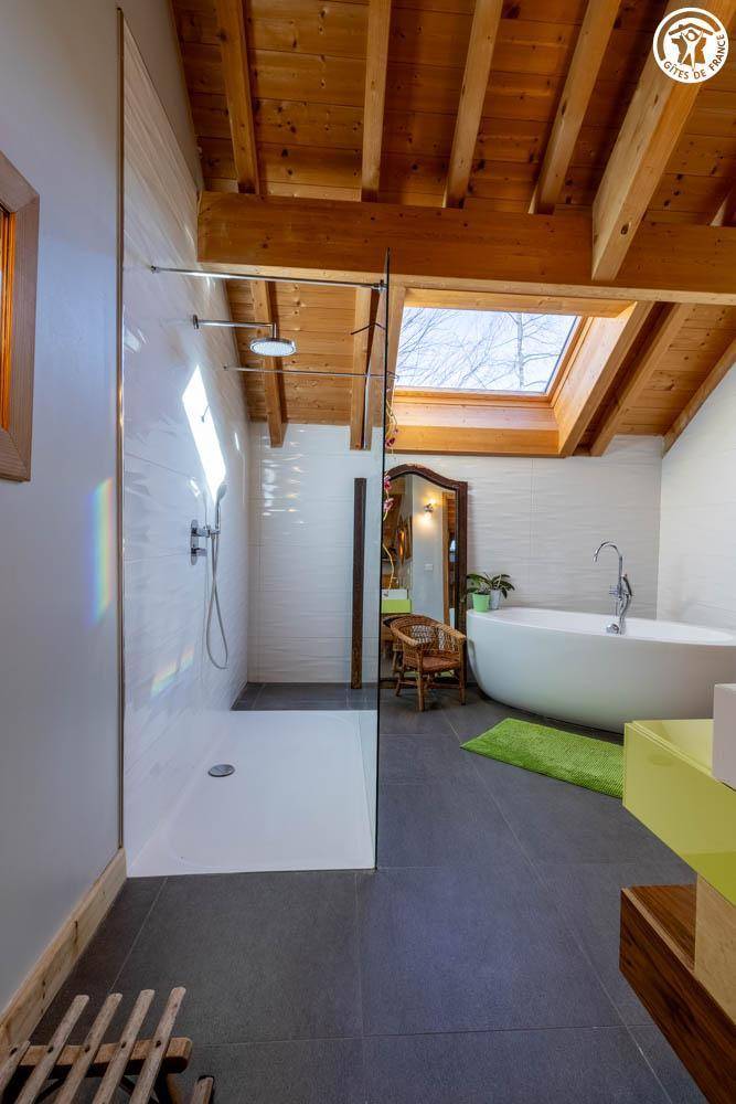 Gite in einem Chalet, zu dem auch ein weiteres Gîte gehört. Im Erdgeschoss des Chalets, unabhängiger Eingang, auf 4 Ebenen. Im Erdgeschoss: Wohnküche, 1 Schlafzimmer (1 Doppelbett 140x200 cm mit Bad (Dusche)), separates WC, Ankleidezimmer, 1 Schlafzimmer (1 Doppelbett 160x200 cm) mit Badezimmer (Dusche + WC). Im 1. Stock: Badezimmer (Dusche + Badewanne), WC, 2 Schlafzimmer mit Balkon (1 Doppelbett 140x200 cm mit Schreibtischbereich / 1 Doppelbett 140x200 cm mit Zwischengeschoss, auf dem sich 1 Einzelbett 90x190 cm befindet), Freiraum mit Massagetisch (optionaler Service, der bei den kompetenten Fachleuten des Resorts reserviert werden muss). Im 2. Stock: Schlafzimmer im Zwischengeschoss (ohne Tür) (1 Doppelbett 140x200 cm und Spielbereich). Im Keller: Skischränke und Umkleideraum, Waschküche. 3 private Parkplätze rund um das Chalet. Terrasse mit Spa und Essbereich. 2. Entspannungsterrasse. Skier aus dem nordischen Bereich und dem alpinen Bereich.