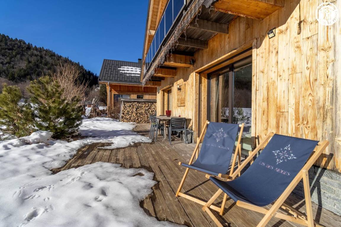 Gemütliche Raumaufteilung und Einrichtung. Sehr komfortabel. Angenehmes Äußeres mit Terrasse und Spa mit freiem Blick auf das Belledonne-Massiv.