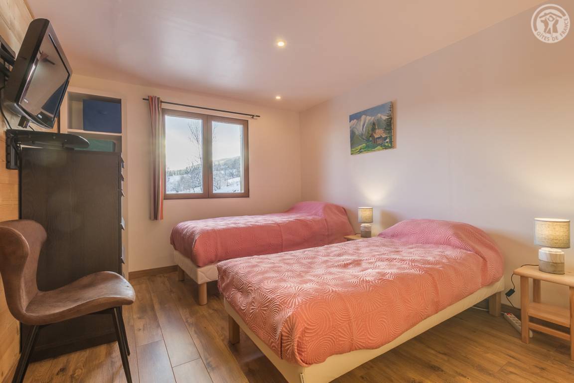Chalet neben dem Hauptwohnsitz des Eigentümers. Unabhängiger Eingang und privater Außenbereich ohne vis-à-vis. Im Erdgeschoss: großer Eingang mit viel Stauraum, Wohnzimmer (Küche offen zum Wohnzimmer) mit gemütlichem Holzofen, Wohnzimmer und Esszimmer. Im Obergeschoss 3 Schlafzimmer (1 Schlafzimmer mit 2 Einzelbetten und 2 Schlafzimmer mit einem Doppelbett). Vermietung von Bettwäsche und Handtüchern. Duschraum (Dusche mit Thermostatventil) mit WC. Angenehme Terrasse mit Panoramablick auf die Berge. Parkplatz vor Ort. WIFI-Internetverbindung.