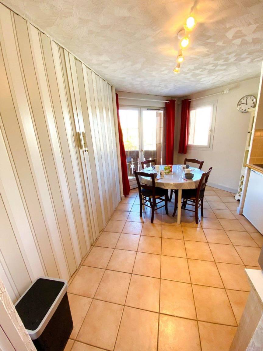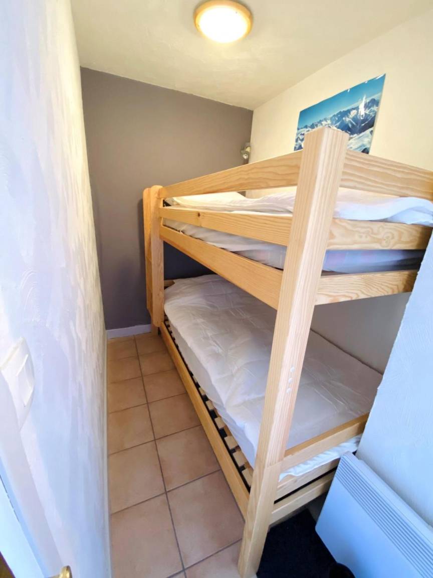 Fläche von ungefähr 23 m². 1te Etage. Orientierung : Nord, Ost, West. Wohnzimmer mit Klappschlafcouch. offener Schlafbereich mit 2 Stockbetten. Kochnische mit Wasserkocher, Kaffeemaschine, kleiner Backofen mit Mikrowellenfunktion, Toaster, Geschirrspülmaschine, 4 Glaskeramikkochfelder, Kühlschrank. Waschräume mit Dusche. WC. Balkon. Die oberen Betten sind nicht für Kinder unter 6 Jahren geeignet.
