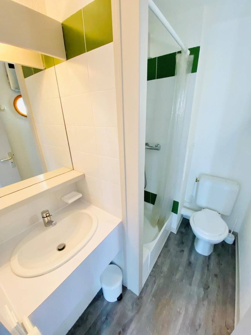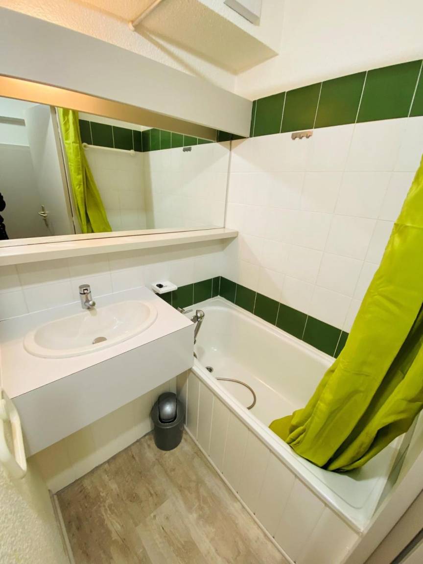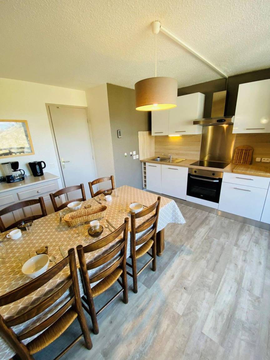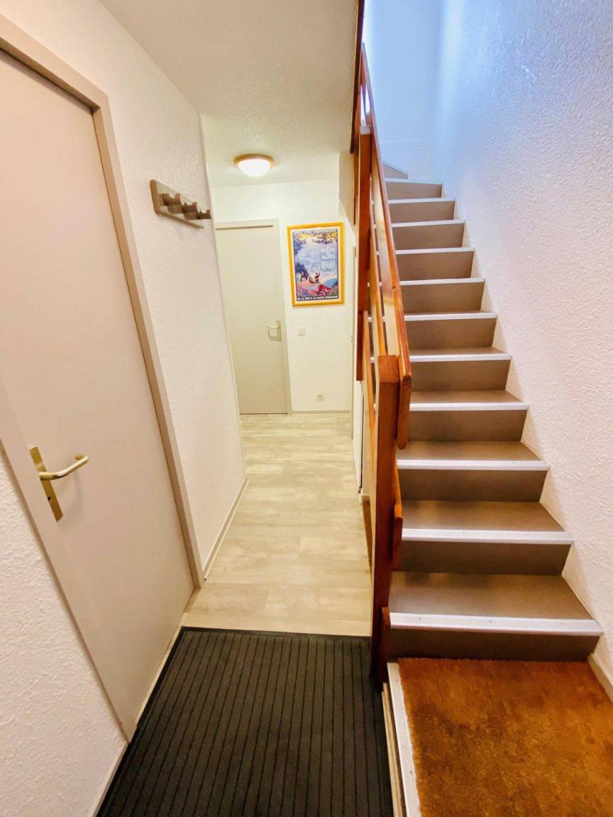 Fläche von ungefähr 50 m². 10te Etage. Orientierung : Nord. Niveau 0 : Schlafzimmer mit 2 Stockbetten (90*190). Kochnische mit Fonduegerät, Raclettegerät, Wasserkocher, Kaffeemaschine, Backofen, Geschirrspülmaschine, Mikrowellenherd, 4 Glaskeramikkochfelder, Kühl-Gefrier-Kombination. Badezimmer mit Badewanne. separates WC. 2 Balkone. Niveau 1 : Wohnzimmer mit BZ-Sofas (140*190). Schlafzimmer mit Doppelbett (140*190), einfaches Mezzanine Bett (90*190). Waschräume mit Dusche, WC. Die oberen Betten sind nicht für Kinder unter 6 Jahren geeignet.