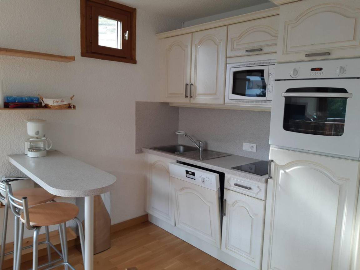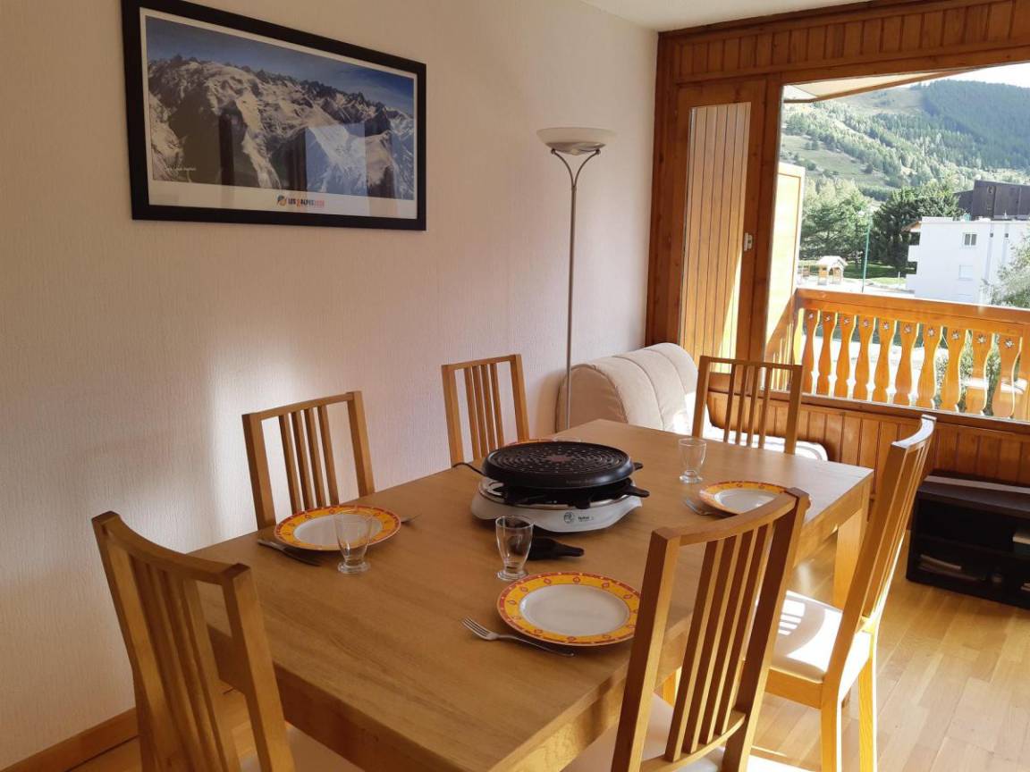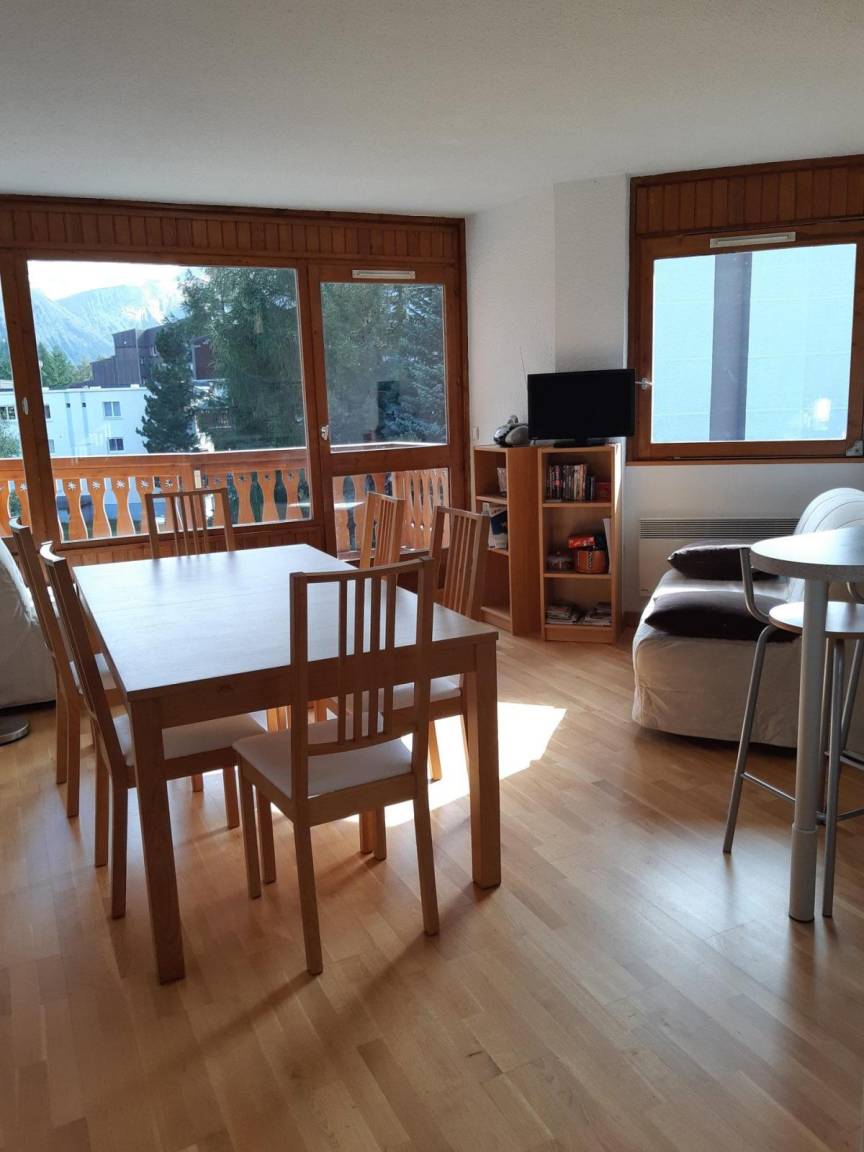 Die Residenz Plein Sud liegt im Herzen des Resorts am Fuße der Jandri Express-Seilbahn, die direkt zum Gletscher führt. In der Nähe von Geschäften, der Eisbahn, dem Schwimmbad, dem Kindergarten, der Kindertagesstätte und dem Freizeitzentrum. Es ist ein idealer Ort für Familien oder Gruppen von Freunden. Fläche von ungefähr 42 m². 2te Etage. Orientierung : Süd. Blick skipisten und Berg. Wohnzimmer mit Klappschlafcouch. Schlafzimmer mit Doppelbett. offener Schlafbereich mit Doppelbett, 2 Stockbetten. Kochnische mit Raclettegerät, Wasserkocher, Kaffeemaschine, Backofen, Toaster, Geschirrspülmaschine, Mikrowellenherd, 2 Induktionsherdplatten, Kühlschrank. Waschräume. separates WC. Balkon. Die oberen Betten sind nicht für Kinder unter 6 Jahren geeignet.