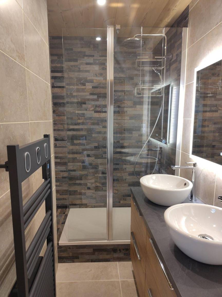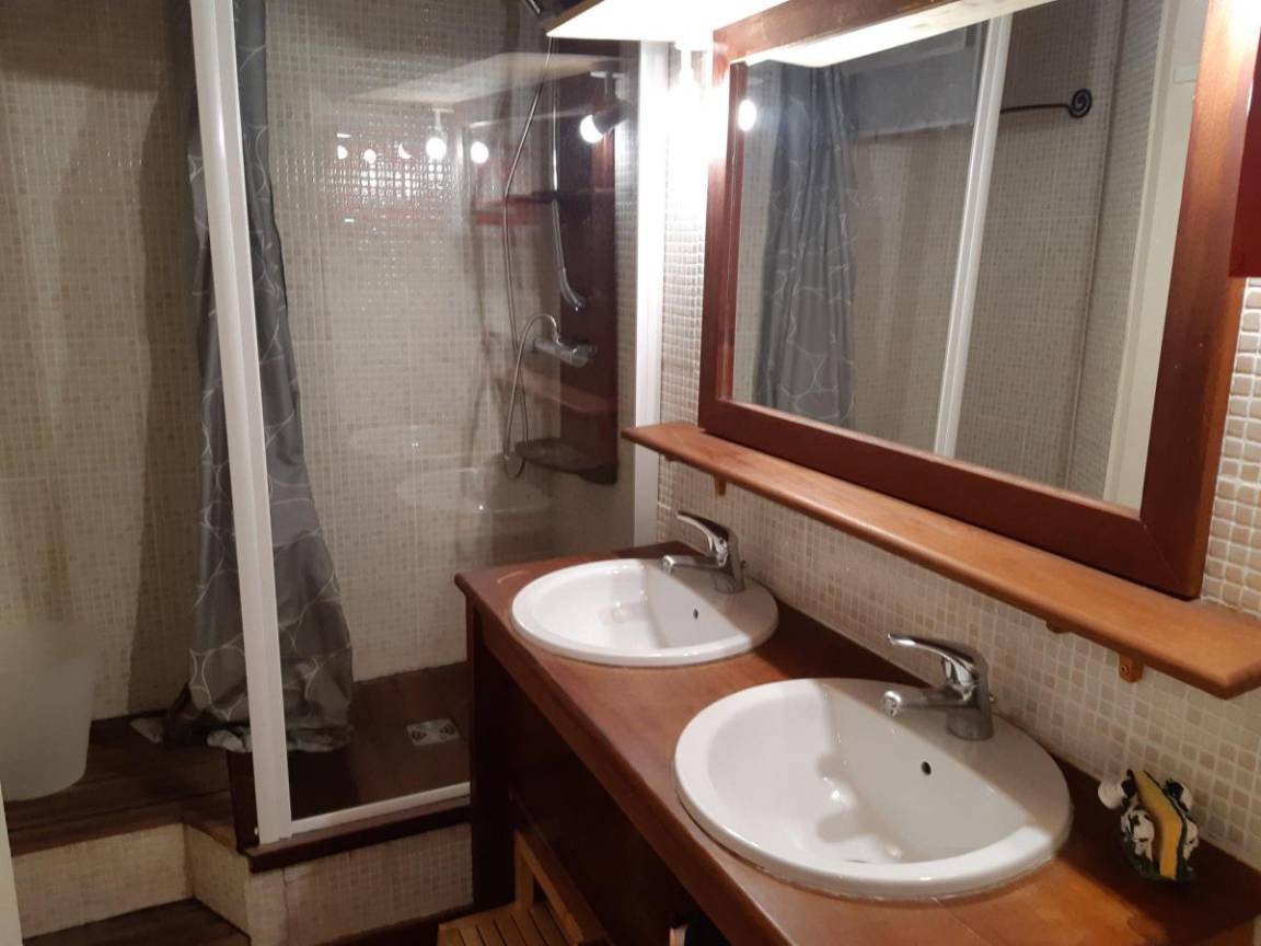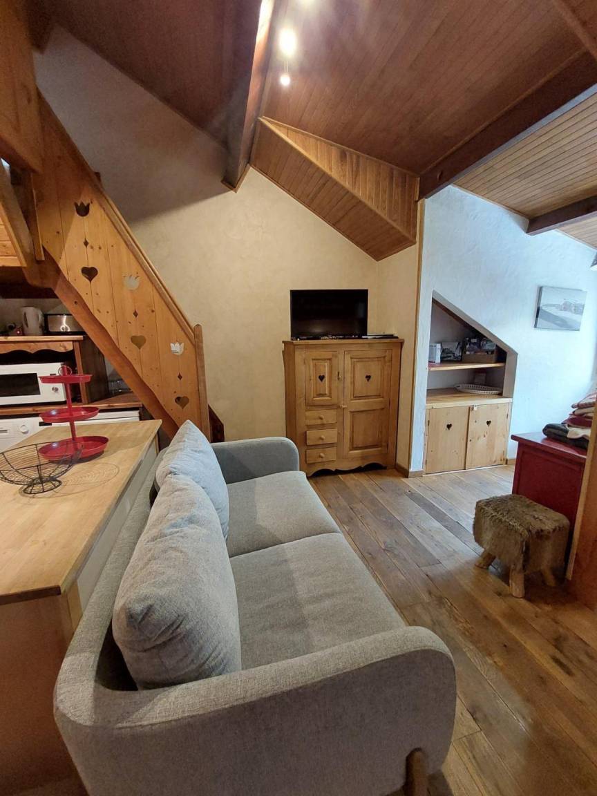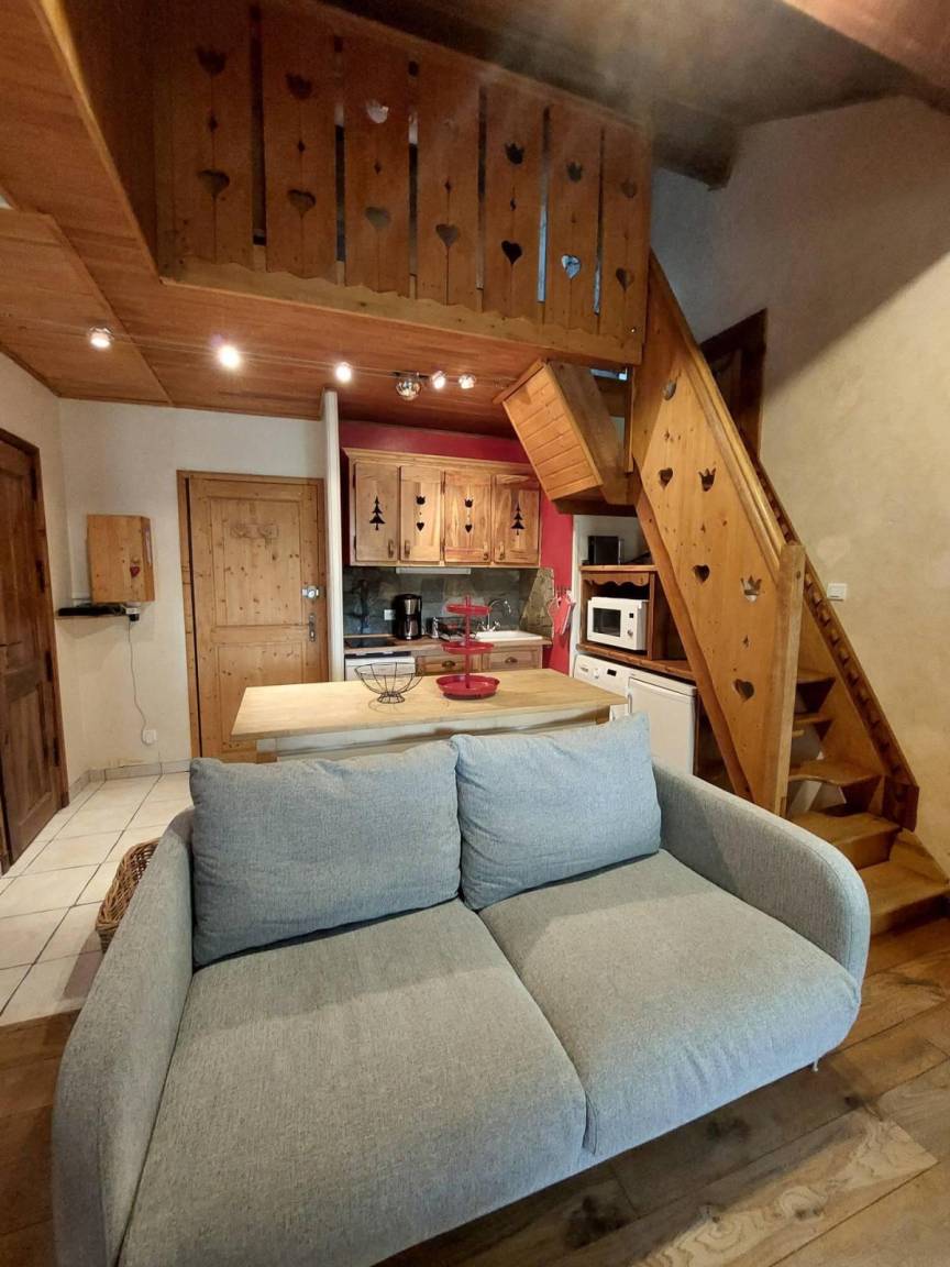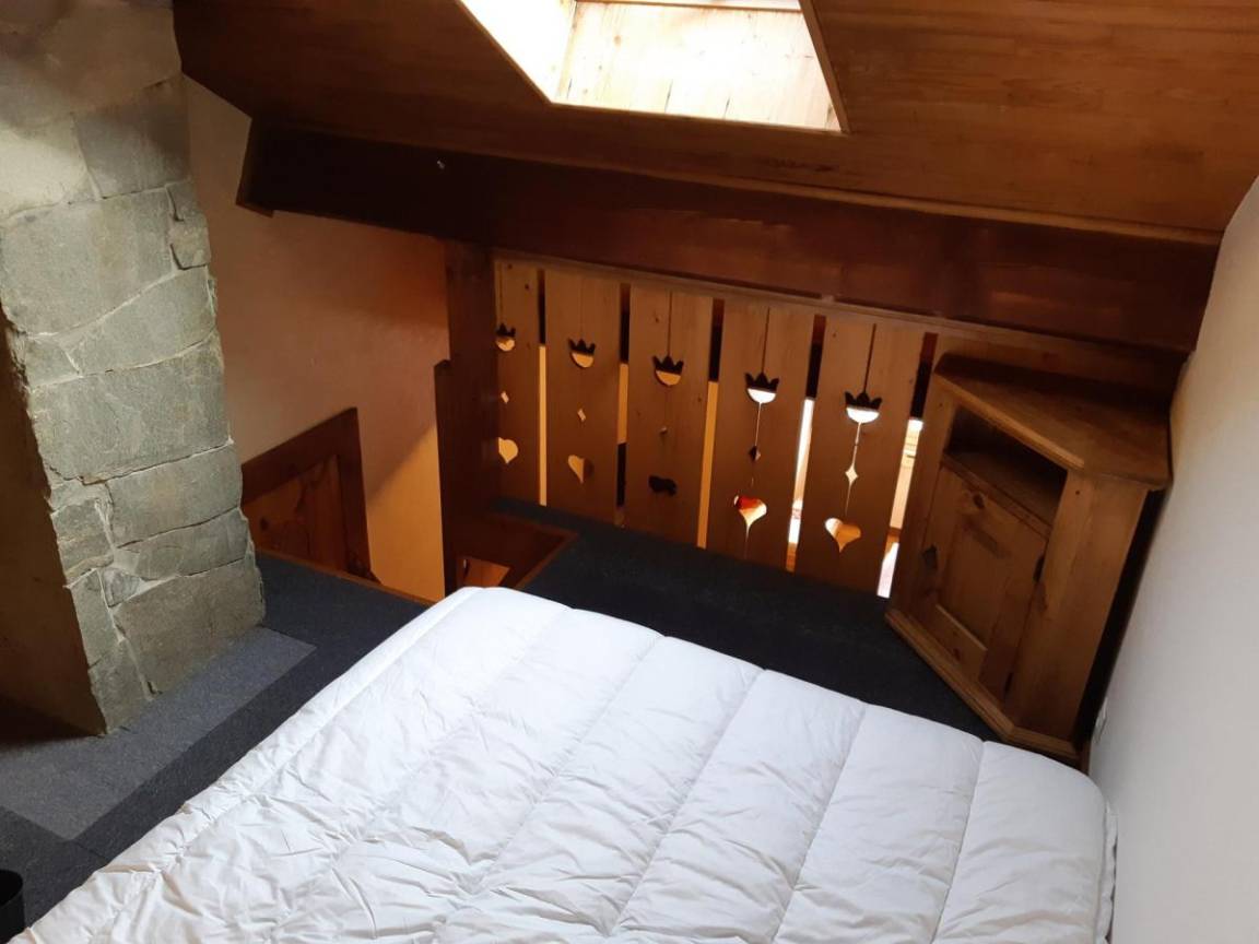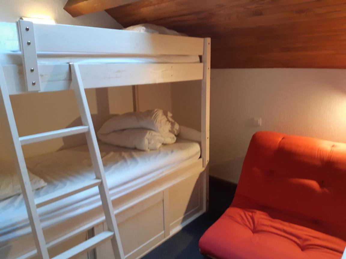 Fläche von ungefähr 44 m² enthält 1 m² unter 1,80 m. 4te Etage. Orientierung : Ost. Niveau 0 : Wohnzimmer mit Sofa. Zwischengeschoss mit Doppelbett (140x190). Kochnische mit Fonduegerät, Raclettegerät, Wasserkocher, Kaffeemaschine, kleiner Backofen mit Mikrowellenfunktion, Geschirrspülmaschine, 2 Glaskeramikkochfelder, Kühlschrank. Waschräume mit italienische Duschkabine, Waschmaschine. separates WC. Sauna. Niveau 1 : Schlafzimmer mit 2 Stockbetten (90x190). offener Schlafbereich mit Doppelbett (140x190). Die oberen Betten sind nicht für Kinder unter 6 Jahren geeignet.