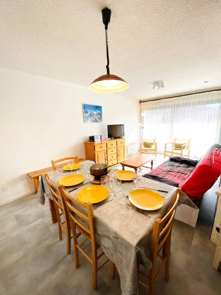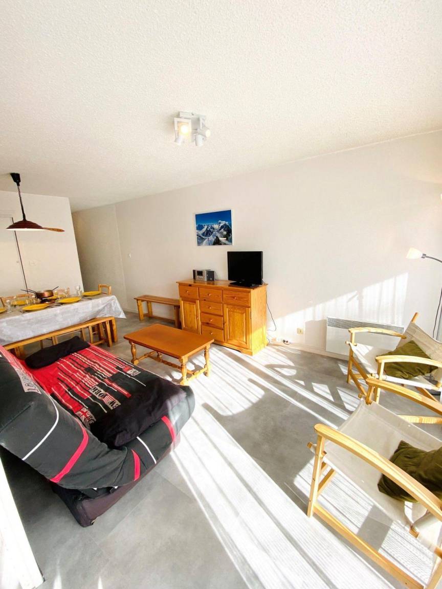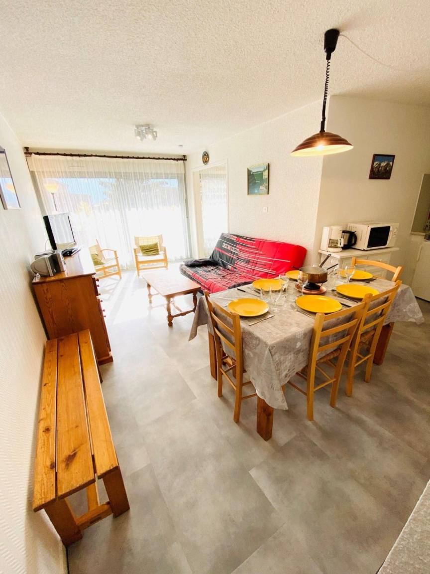 Fläche von ungefähr 47 m². 4te Etage. Orientierung : Süd. Wohnzimmer mit Klappschlafcouch. Schlafzimmer mit Doppelbett (140*190), schiebetüren. offener Schlafbereich mit 2 Stockbetten (80*190). Kochnische mit Fonduegerät, Raclettegerät, Wasserkocher, Kaffeemaschine, Backofen, Toaster, Geschirrspülmaschine, Mikrowellenherd, 4 Induktionsherdplatten, Kühlschrank. separates WC. Badezimmer mit Badewanne. Balkon. Die oberen Betten sind nicht für Kinder unter 6 Jahren geeignet.