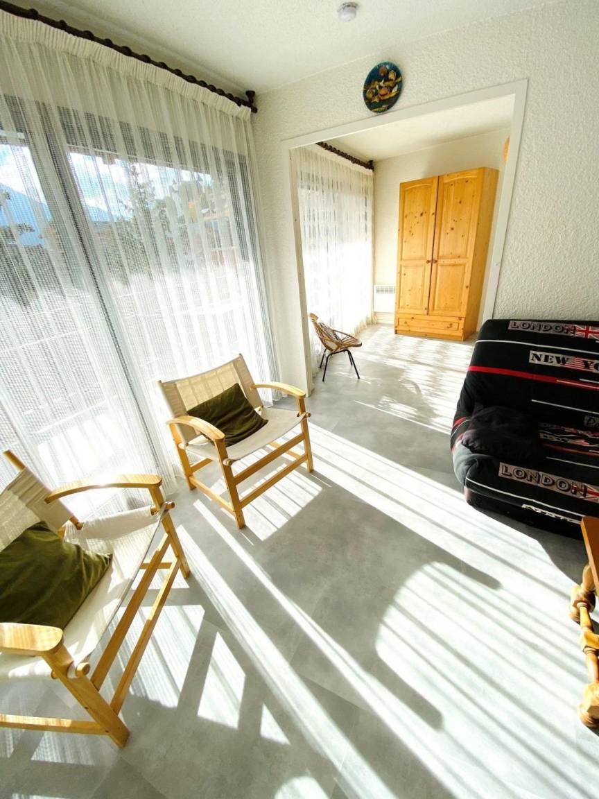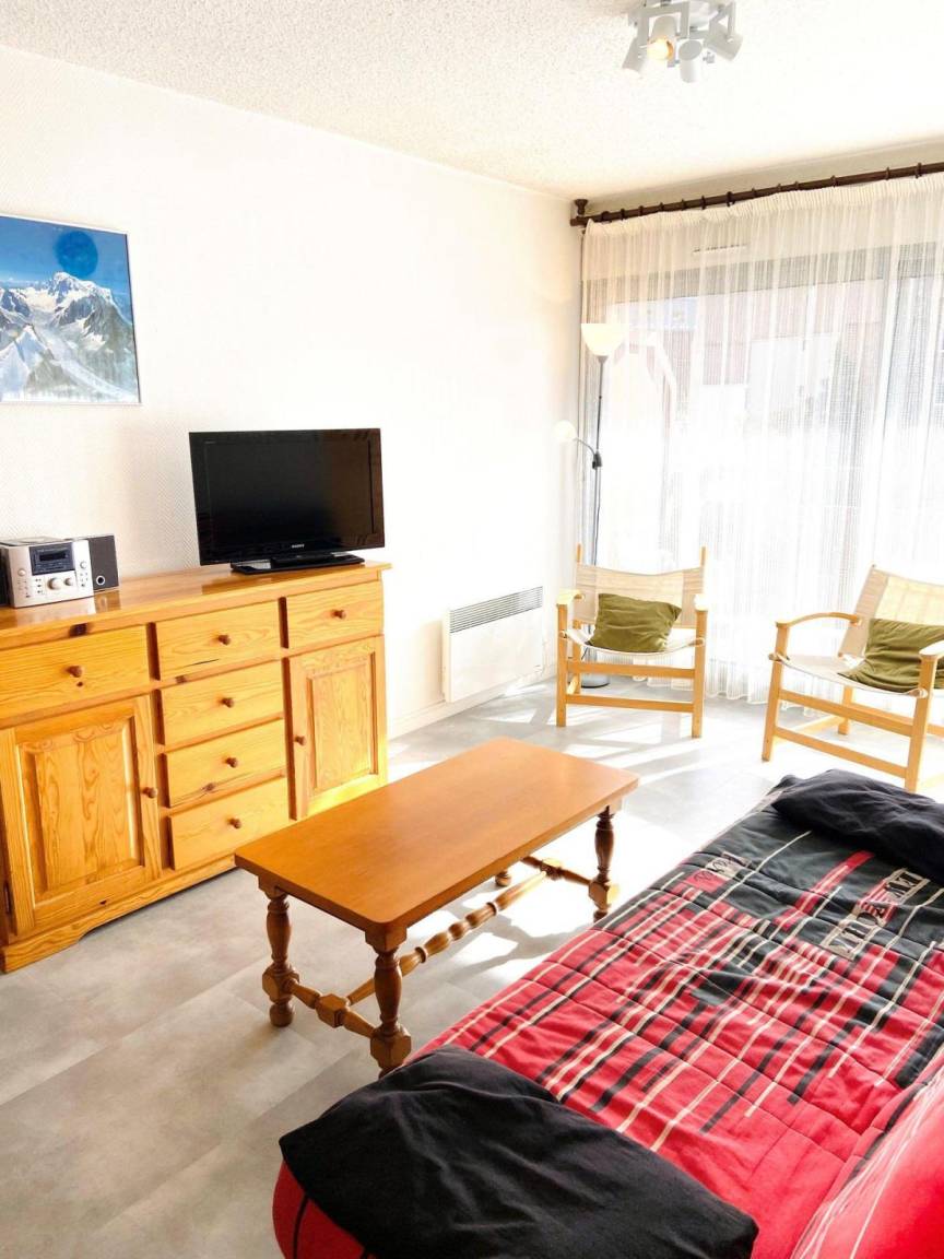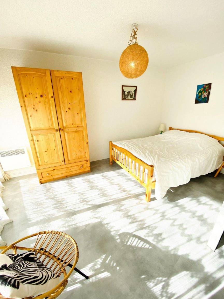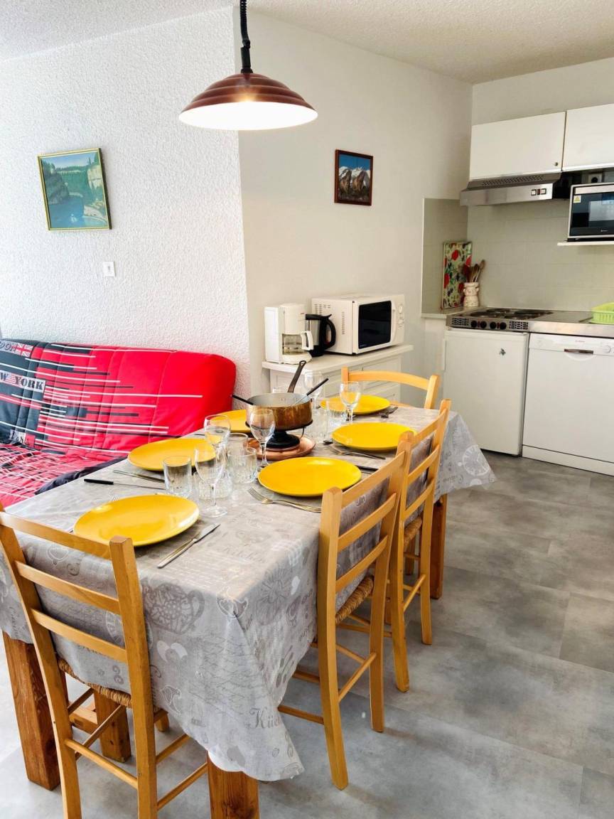 Fläche von ungefähr 47 m². 4te Etage. Orientierung : Süd. Wohnzimmer mit Klappschlafcouch. Schlafzimmer mit Doppelbett (140*190), schiebetüren. offener Schlafbereich mit 2 Stockbetten (80*190). Kochnische mit Fonduegerät, Raclettegerät, Wasserkocher, Kaffeemaschine, Backofen, Toaster, Geschirrspülmaschine, Mikrowellenherd, 4 Induktionsherdplatten, Kühlschrank. separates WC. Badezimmer mit Badewanne. Balkon. Die oberen Betten sind nicht für Kinder unter 6 Jahren geeignet.
