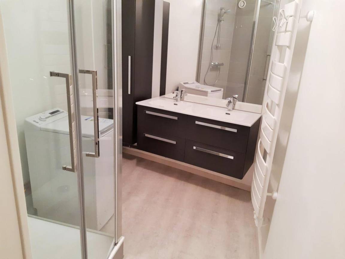 Fläche von ungefähr 47 m². 1te Etage. Orientierung : Süd. Wohnzimmer mit Klappschlafcouch (140x190). Schlafzimmer mit Doppelbett (140 x190), Vorhang zum schließen. offener Schlafbereich mit 2 Stockbetten (80 x190). Kochnische mit Raclettegerät, Wasserkocher, Kaffeemaschine, Backofen, Toaster, Geschirrspülmaschine, Mikrowellenherd, 3 Glaskeramikkochfelder, Kühlschrank. Waschräume mit Dusche. separates WC. Balkon. Die oberen Betten sind nicht für Kinder unter 6 Jahren geeignet.