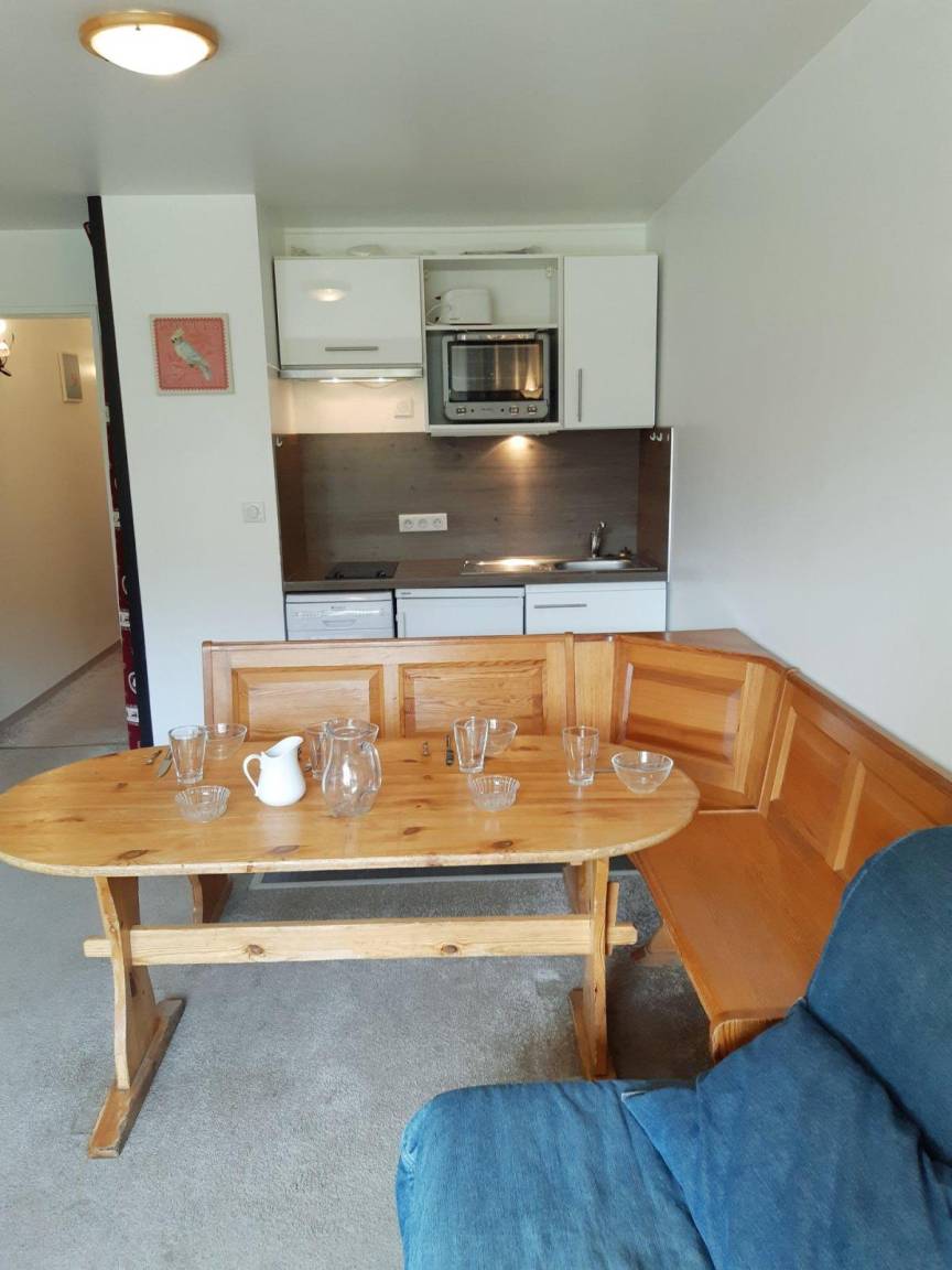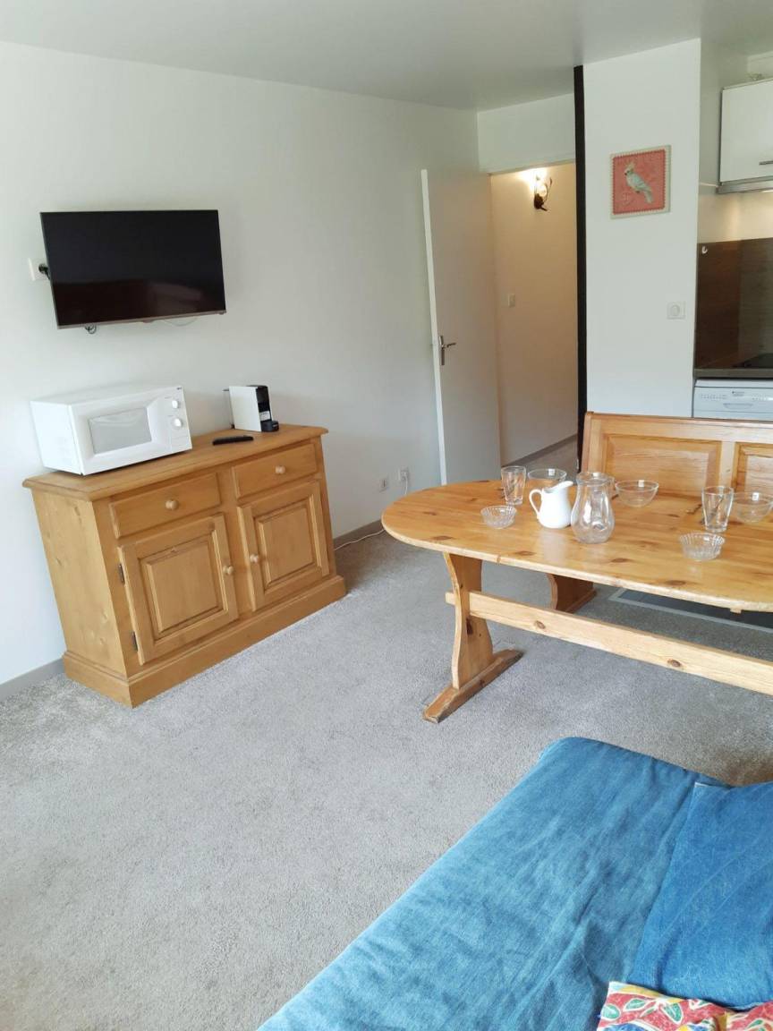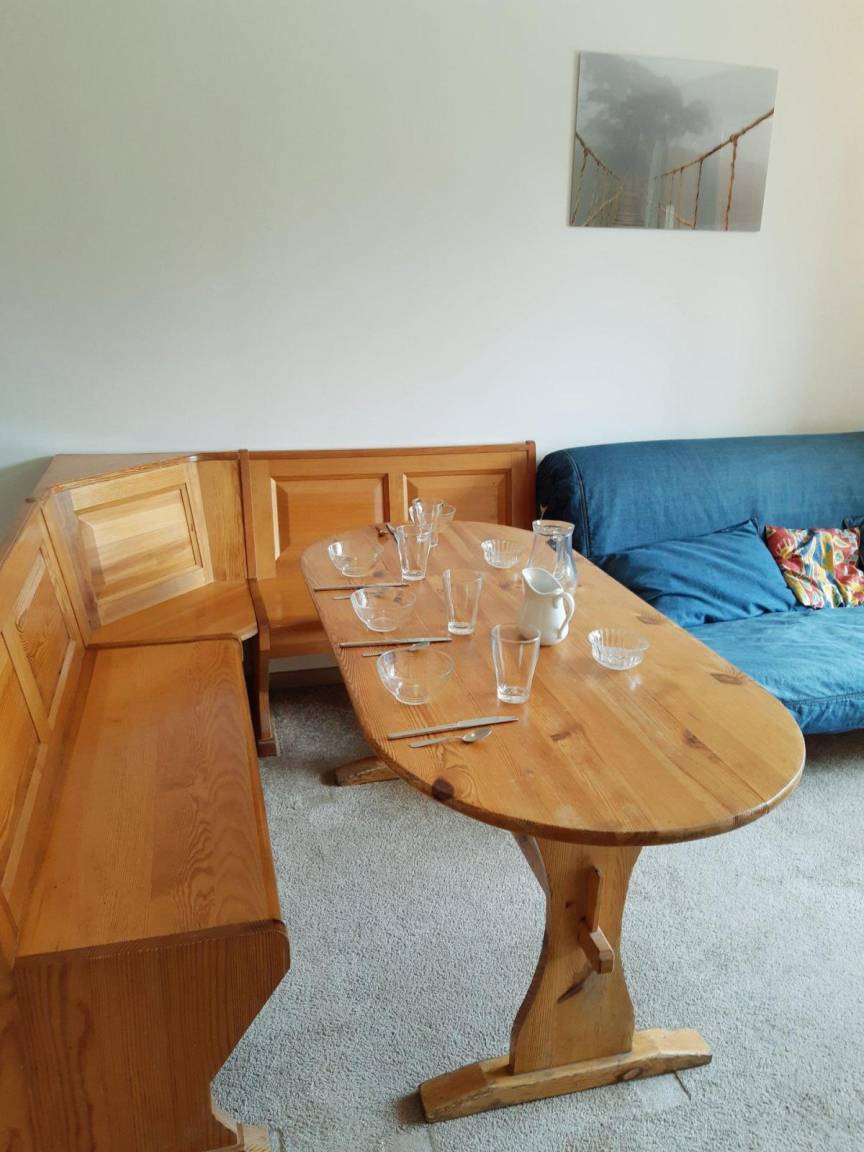 Fläche von ungefähr 30 m². 2te Etage. Orientierung : Süd. Blick skipisten. Wohnzimmer mit BZ-Sofas (160*200). offener Schlafbereich mit 3 Stockbetten (80*190). Kochnische mit Raclettegerät, Wasserkocher, Kaffeemaschine, Backofen, Toaster, Geschirrspülmaschine, Mikrowellenherd, 2 Glaskeramikkochfelder, Kühlschrank. Badezimmer mit Badewanne. separates WC. Balkon. Die oberen Betten sind nicht für Kinder unter 6 Jahren geeignet.