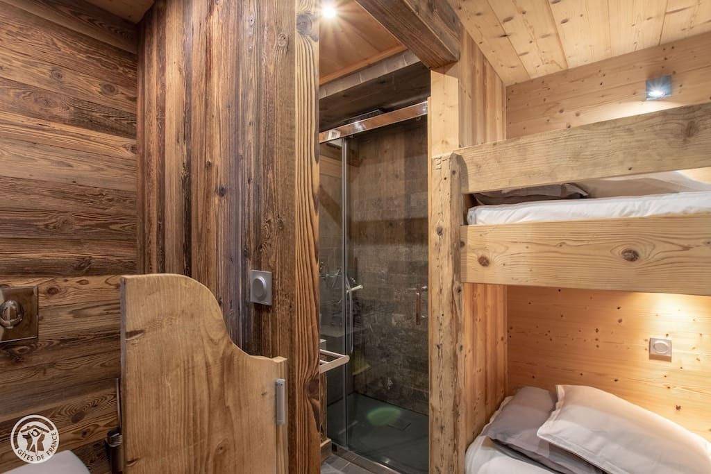 Fläche von ungefähr 220 m². Orientierung : Süd. Blick berg. Wohnzimmer. 3 Schlafzimmer mit Doppelbett (180*200), Waschraum, Haartrockner, WC. Schlafzimmer mit 4 Stockbetten, Waschraum, WC. Schlafzimmer mit Dusche, Doppelbett (180*200), Badezimmer, Haartrockner, WC. Zwischengeschoss. Küche mit Fonduegerät, Raclettegerät, Gefrierschrank, Backofen, Geschirrspülmaschine, Mikrowellenherd, Kühlschrank. separates WC. Waschküche mit Waschmaschine. Terrasse mit Grillrost, Whirlpool, . Die oberen Betten sind nicht für Kinder unter 6 Jahren geeignet.