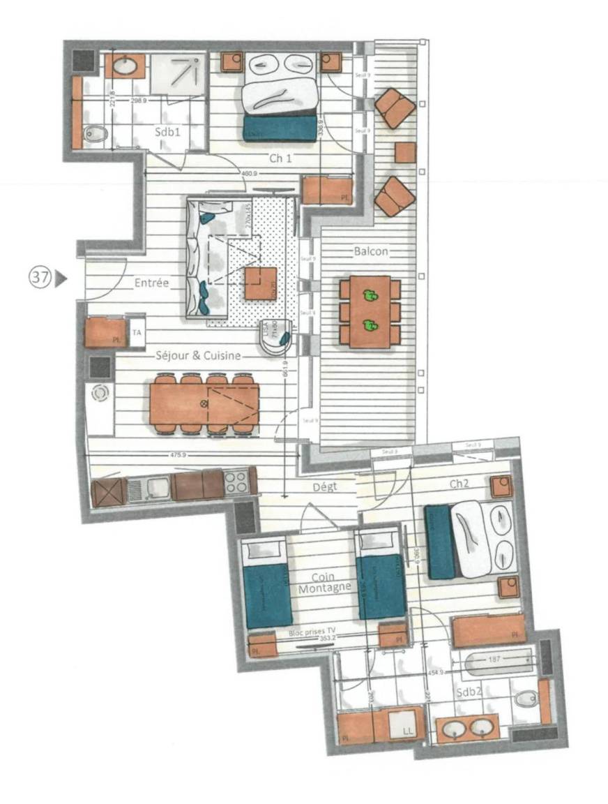 Fläche von ungefähr 82 m². 4te Etage. Orientierung : Ost. Wohnzimmer mit Kamin. 2 Schlafzimmer mit Doppelbett. Küche mit Wasserkocher, Kaffeemaschine (Nespresso), Backofen, Toaster, Dunstabzugshaube, Waschmaschine, Geschirrspülmaschine, 2 Herdplatten, , Kühlschrank. Badezimmer mit Haartrockner, Handtuchtrockner, WC. Badezimmer mit Handtuchtrockner, WC. Balkon. mit 3 Stockbetten. Die oberen Betten sind nicht für Kinder unter 6 Jahren geeignet.