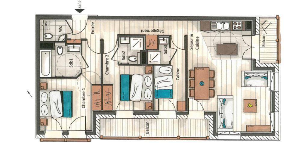 Fläche von ungefähr 83 m². 1te Etage. Orientierung : West. Wohnzimmer. Schlafzimmer mit Doppelbett, , Haartrockner, Handtuchtrockner, WC. Schlafzimmer mit Doppelbett, , Haartrockner, Handtuchtrockner, WC. offener Schlafbereich mit 2 Stockbetten, , Haartrockner, Handtuchtrockner, WC. Küche mit Wasserkocher, Kaffeemaschine (Nespresso), Backofen, Toaster, Dunstabzugshaube, Waschmaschine, Geschirrspülmaschine, 2 Herdplatten, , Kühlschrank. separates WC. Balkon. Die oberen Betten sind nicht für Kinder unter 6 Jahren geeignet.