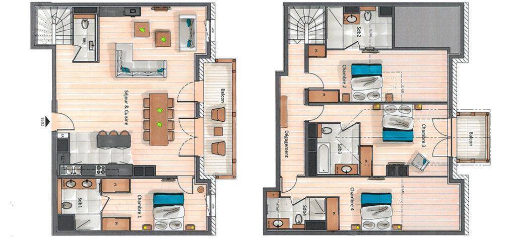 Fläche von ungefähr 158 m². 3te Etage. Orientierung : Nord. Niveau 0 : Wohnzimmer mit Kamin. Schlafzimmer mit Doppelbett, , Haartrockner, Handtuchtrockner, WC. Küche mit Wasserkocher, Kaffeemaschine (Nespresso), Backofen, Toaster, Dunstabzugshaube, Waschmaschine, Geschirrspülmaschine, 2 Herdplatten, , Kühlschrank. separates WC. Balkon. Niveau 1 : 2 Schlafzimmer mit Doppelbett, , Haartrockner, Handtuchtrockner, WC. Schlafzimmer mit Balkon, Doppelbett, , Haartrockner, Handtuchtrockner, WC.