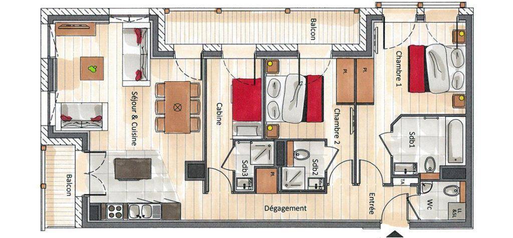 Fläche von ungefähr 82 m². 1te Etage. Orientierung : West. Wohnzimmer. Schlafzimmer mit Doppelbett, , Haartrockner, Handtuchtrockner, WC. Schlafzimmer mit Doppelbett, , Haartrockner, Handtuchtrockner, WC. offener Schlafbereich mit 2 Stockbetten, , Haartrockner, Handtuchtrockner. Küche mit Wasserkocher, Kaffeemaschine (Nespresso), Backofen, Toaster, Dunstabzugshaube, Waschmaschine, Geschirrspülmaschine, 2 Herdplatten, , Kühlschrank. separates WC. Balkon. Die oberen Betten sind nicht für Kinder unter 6 Jahren geeignet.