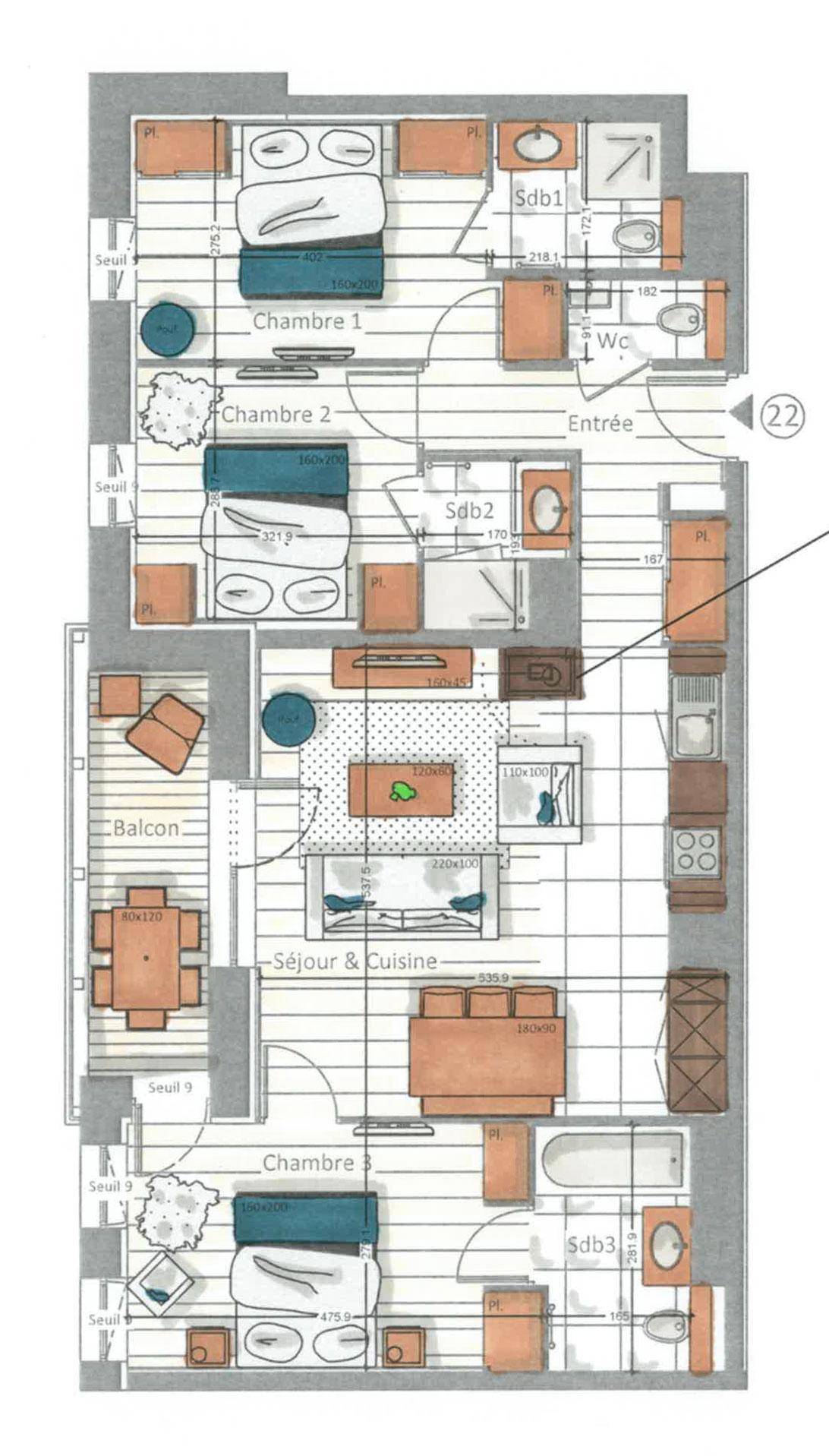 Fläche von ungefähr 86 m². 3te Etage. Orientierung : West. Wohnzimmer. Schlafzimmer mit Doppelbett, , Haartrockner, Handtuchtrockner, WC. Schlafzimmer mit Doppelbett, , Haartrockner, Handtuchtrockner. Schlafzimmer mit Doppelbett, , Haartrockner, Handtuchtrockner, WC. Küche mit Wasserkocher, Kaffeemaschine (Nespresso), Backofen, Toaster, Dunstabzugshaube, Waschmaschine, Geschirrspülmaschine, 2 Herdplatten, , Kühlschrank. separates WC. Balkon.