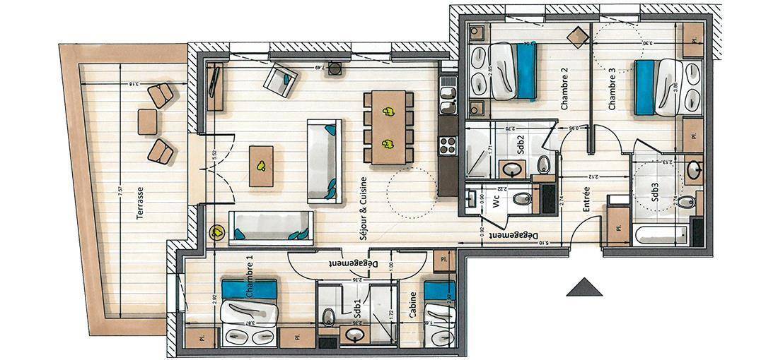 Fläche von ungefähr 109 m². 1te Etage. Orientierung : Nord. Wohnzimmer. Schlafzimmer mit Doppelbett. Schlafzimmer mit Doppelbett, , Haartrockner, Handtuchtrockner, WC. Schlafzimmer mit Doppelbett, , Haartrockner, Handtuchtrockner, WC. offener Schlafbereich mit 2 Stockbetten. Küche mit Wasserkocher, Kaffeemaschine, Backofen, Toaster, Dunstabzugshaube, Waschmaschine, Geschirrspülmaschine, 2 Herdplatten, , Kühlschrank. Badezimmer mit Haartrockner, Handtuchtrockner, WC. separates WC. Terrasse. Die oberen Betten sind nicht für Kinder unter 6 Jahren geeignet.