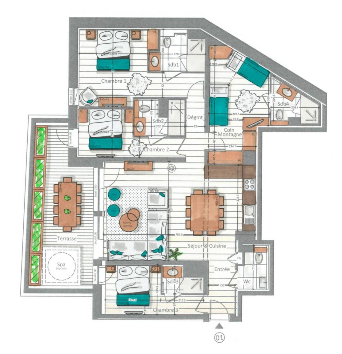 Fläche von ungefähr 110 m². Erdgeschoss. Orientierung : West. Wohnzimmer mit Kamin. 2 Schlafzimmer mit Doppelbett, , Haartrockner, Handtuchtrockner, WC. Schlafzimmer mit Doppelbett, , Haartrockner, Handtuchtrockner. offener Schlafbereich mit Einzelbett, 2 Stockbetten, , Haartrockner, Handtuchtrockner, WC. Küche mit Wasserkocher, Kaffeemaschine (Nespresso), Backofen, Toaster, Dunstabzugshaube, Waschmaschine, Geschirrspülmaschine, 2 Herdplatten, , Kühlschrank. separates WC mit Waschbecken. Terrasse mit Whirlpool. Die oberen Betten sind nicht für Kinder unter 6 Jahren geeignet.