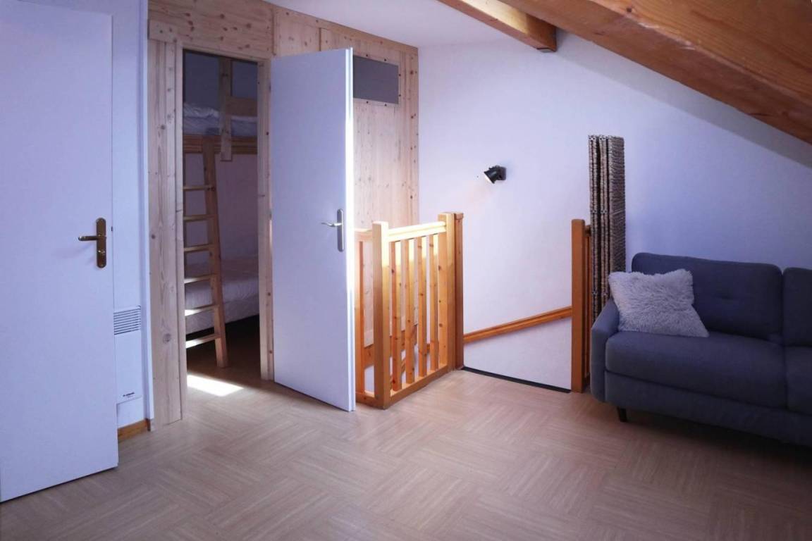 Fläche von ungefähr 62 m². 2te Etage. Orientierung : West. Niveau 0 : Wohnzimmer mit einfache Klappschlafcouch. Kochnische mit Backofen, Geschirrspülmaschine, Mikrowellenherd, Kühl-Gefrier-Kombination. WC. Badezimmer mit Badewanne. Balkon. Niveau 1 : offener Schlafbereich mit 2 Einzelbetten. Schlafzimmer mit Doppelbett. offener Schlafbereich mit einfache Klappschlafcouch. Waschräume mit Dusche, WC.