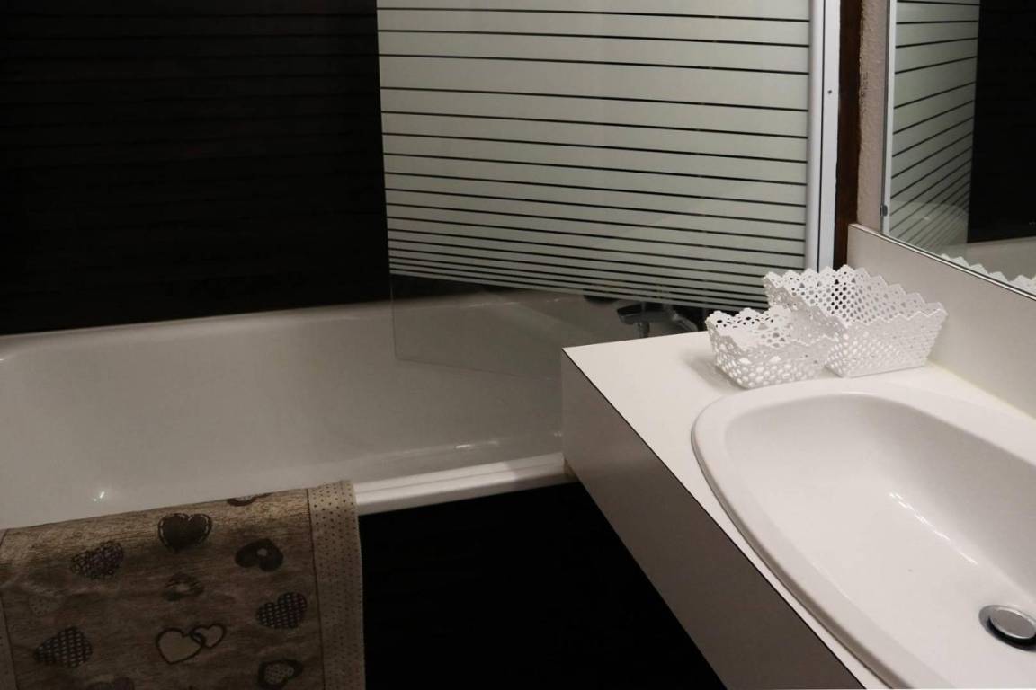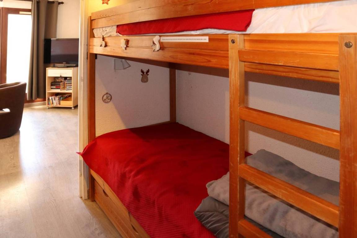 Fläche von ungefähr 30 m². 7te Etage. Orientierung : Süd-West, West. Blick berg. Diele mit 2 Stockbetten. Wohnzimmer mit einfache Klappschlafcouch (2 places), TV. offener Schlafbereich mit Doppelbett. Kochnische mit Backofen, kleiner Backofen mit Mikrowellenfunktion, Geschirrspülmaschine, Kühlschrank. Badezimmer mit Badewanne. separates WC. Balkon. Die oberen Betten sind nicht für Kinder unter 6 Jahren geeignet.