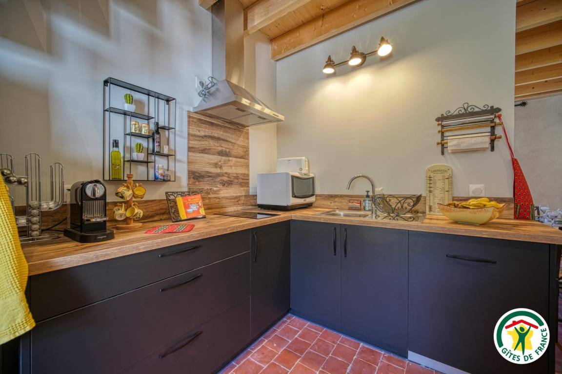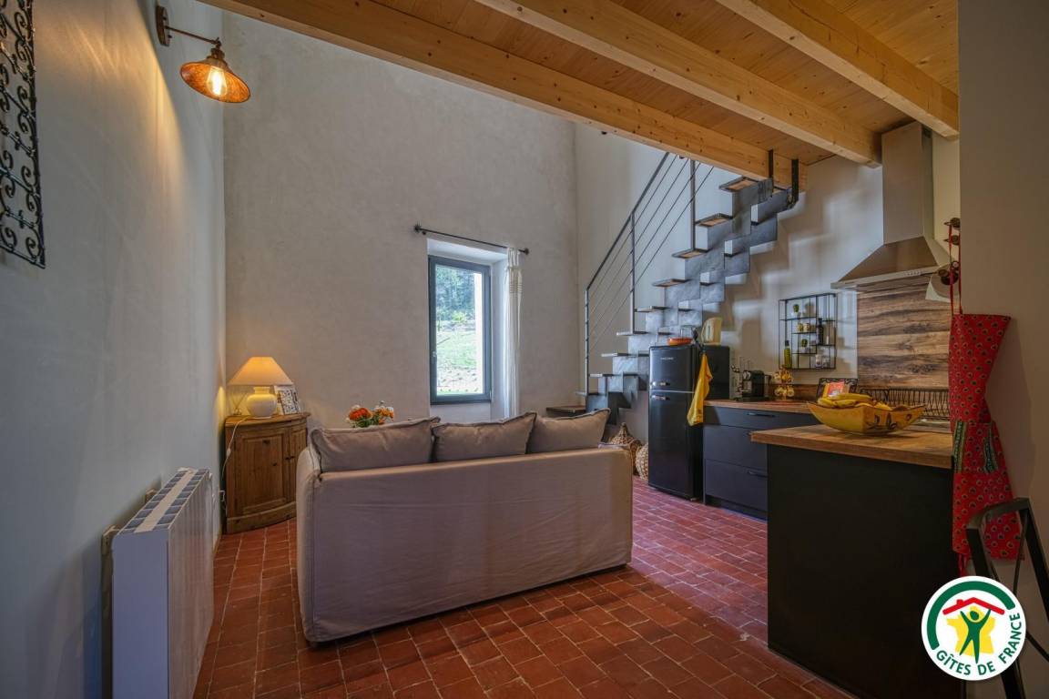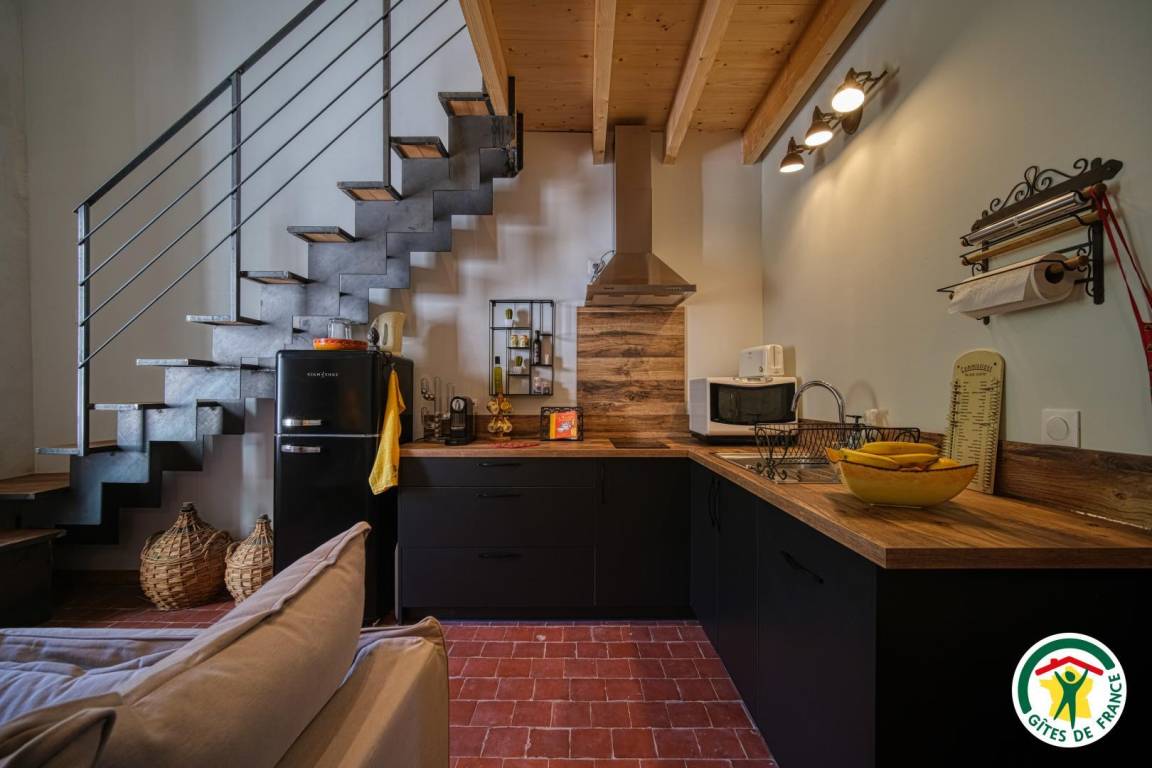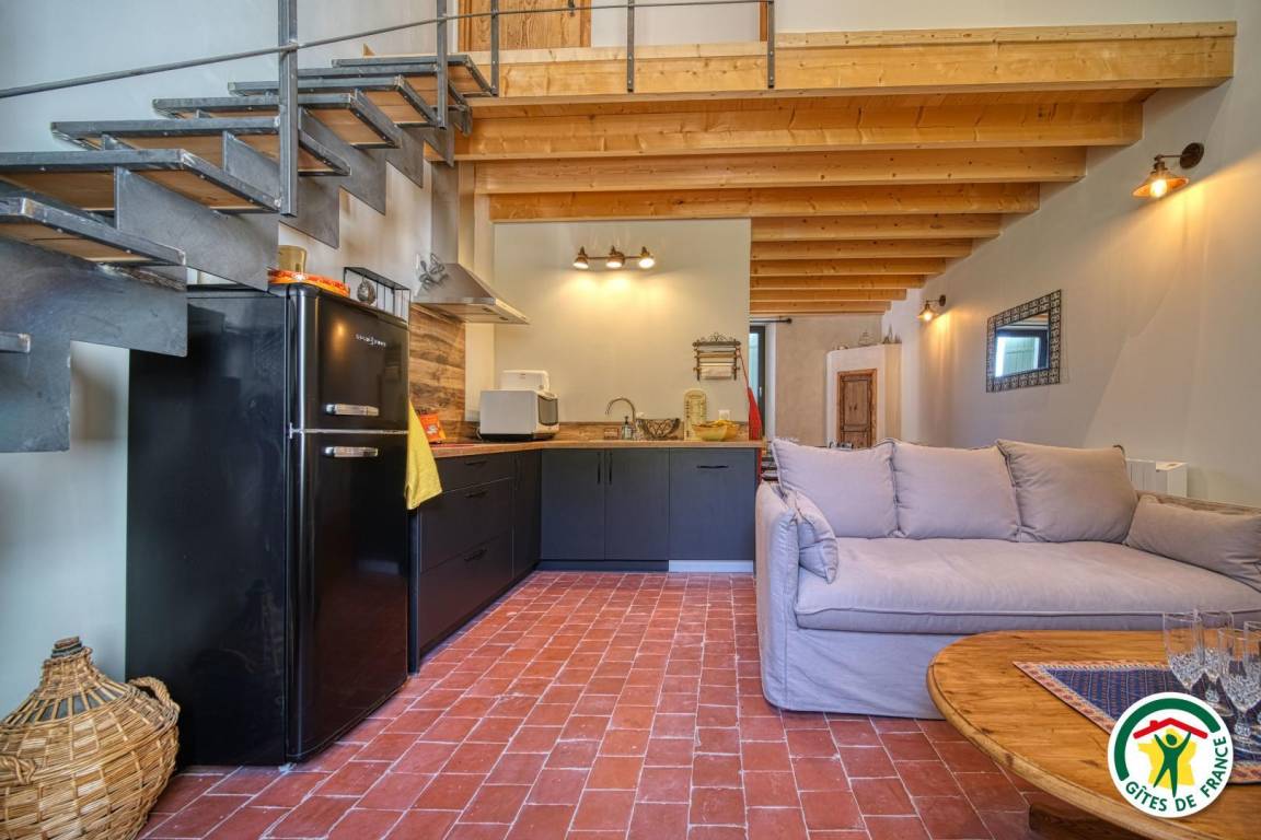 Der Zugang zur Gîte erfolgt über eine Außentreppe, die mit einer anderen benachbarten Gîte geteilt wird. Im Inneren entdecken Sie einen hellen Wohnraum, ausgestattet mit einer modernen, perfekt ausgestatteten Küche, sowie einen Wohnbereich mit einem Schlafsofa.