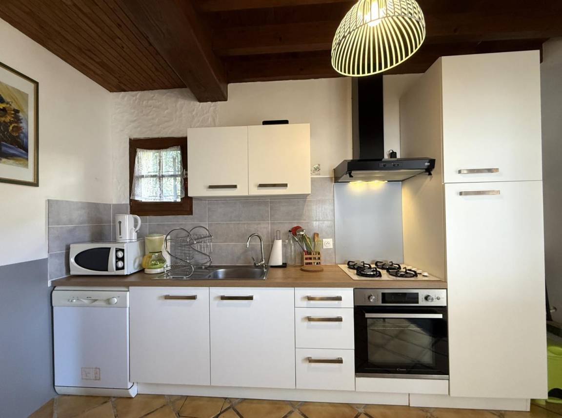 - Ausgestattete Küche (Mikrowelle, Kühl-Gefrierkombination, Gasherd, Elektrobackofen, Geschirrspüler). Speisekammer (Waschmaschine, Einzelspüle).