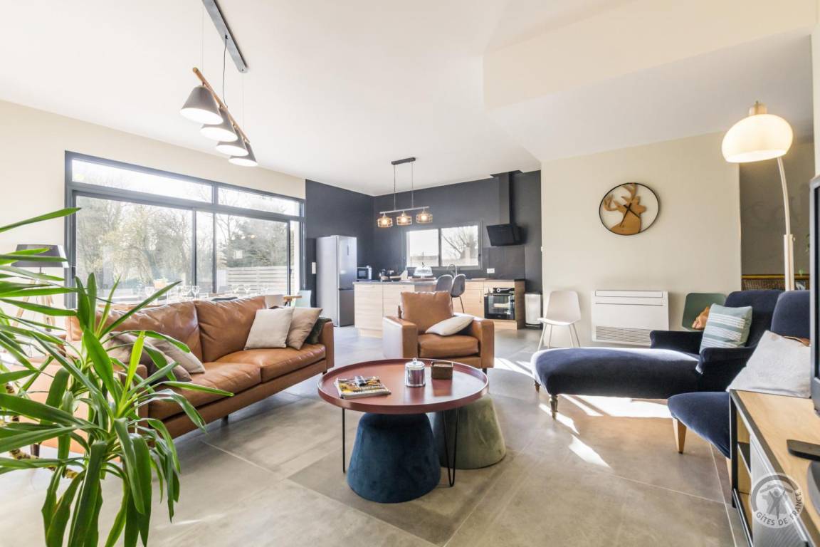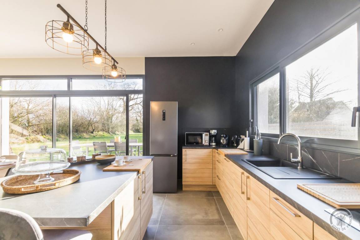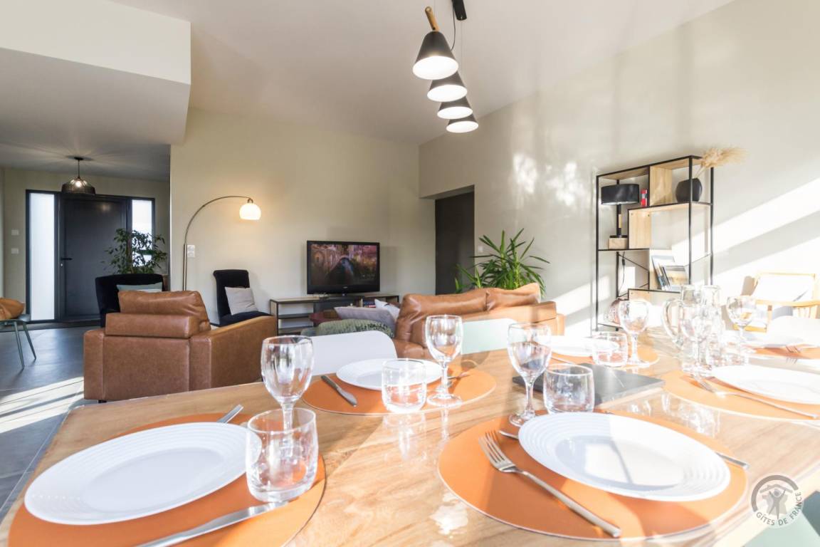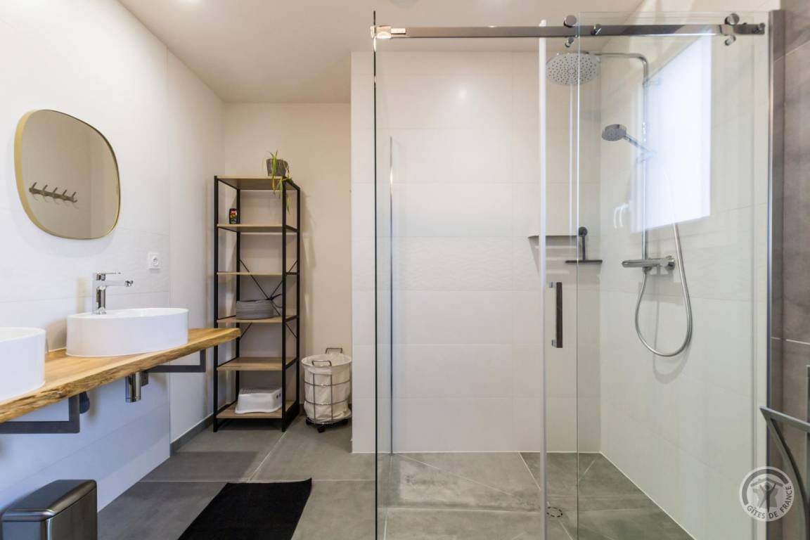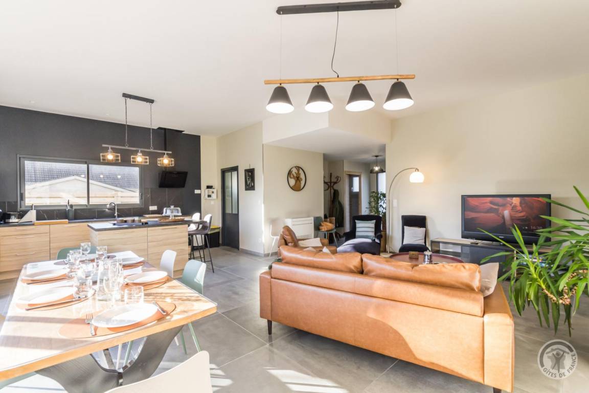 „Un gîte contemporain bien organisé, agréable à vivre: Ensemble cuisine-s. à manger- salon spacieux, très lumineux; sdd large, bien équipée; 2 des ch. nécessiteraient un peu plus de rangement. Peut- être une suggestion: Un store devant la grande baie vitrée au sud serait le bienvenu pour les journées estivales de plus en plus chaudes.“