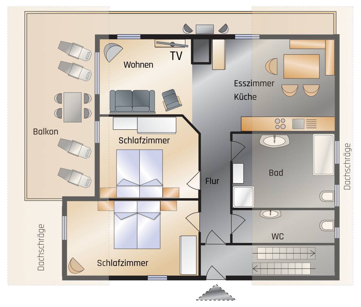 Beschreibung der Ferienwohnung Silbermond: 3-Zimmer-Wohnung mit 82 qm im Dachgeschoss.