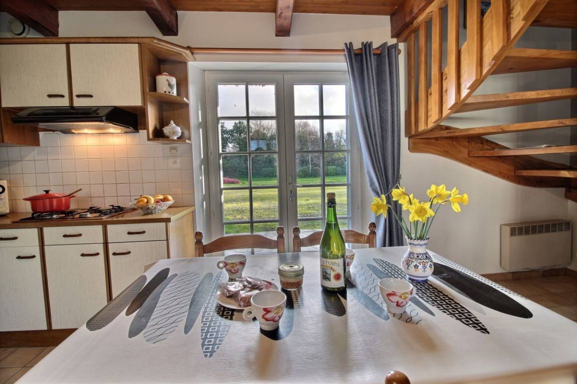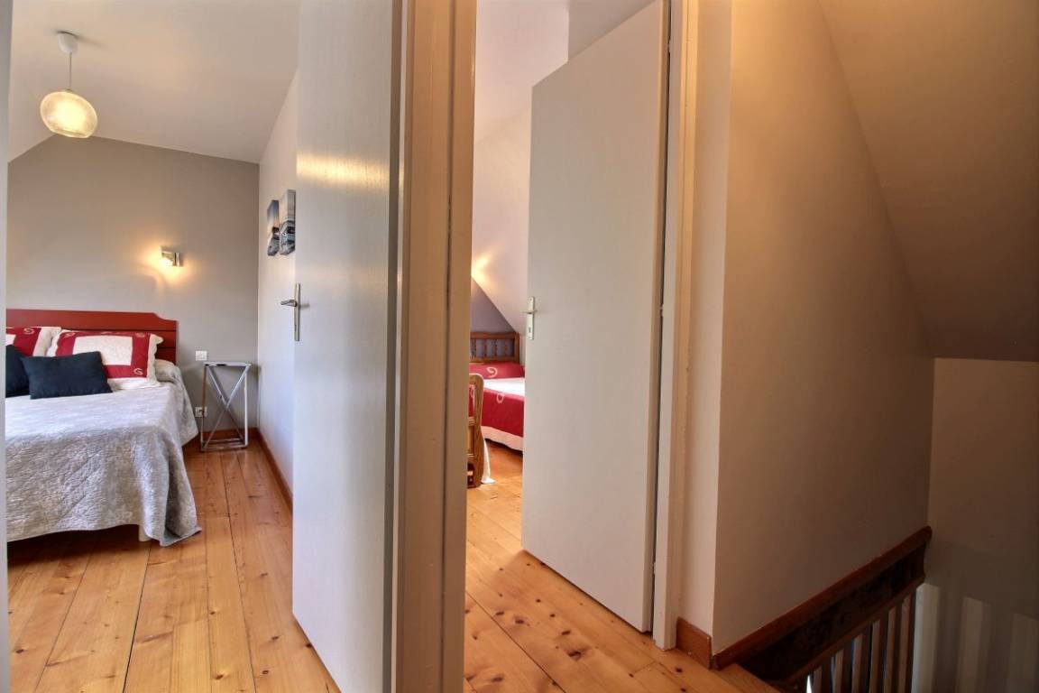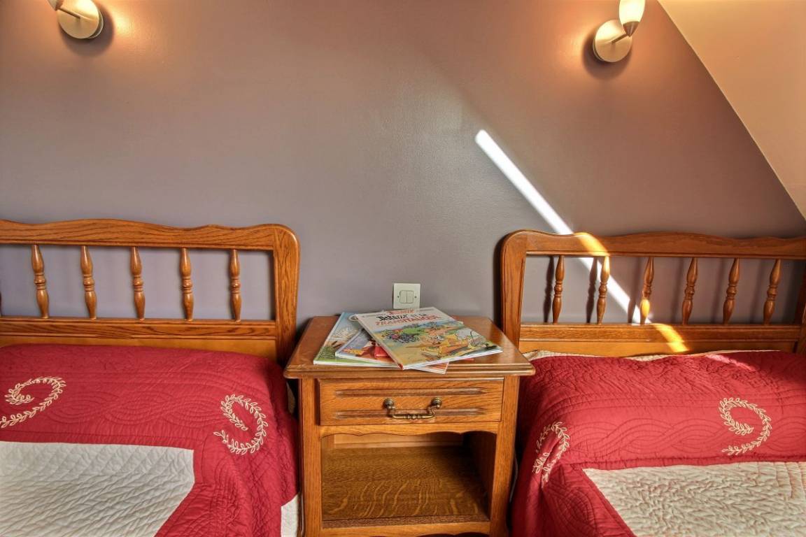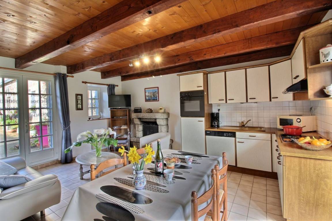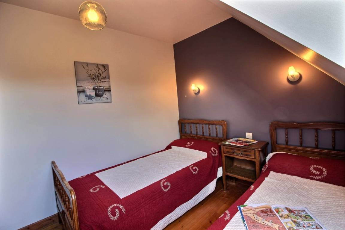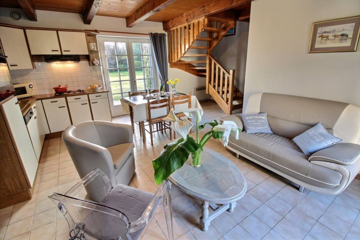 Ihre Ferienwohnung umfasst im Erdgeschoss: Wohnzimmer mit Sitzecke und Küchenbereich, WC. Etage: 2 Schlafzimmer (1 Doppelbett 140 * 190, 2 Einzelbetten 90 * 190), Badezimmer mit Badewanne, WC. Großer Hof, Liegewiese (500m²). Wäschetrockner gemeinsam mit den 3 Unterkünften.