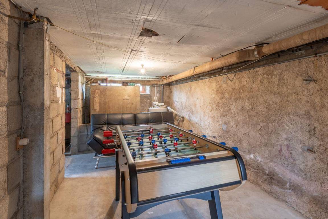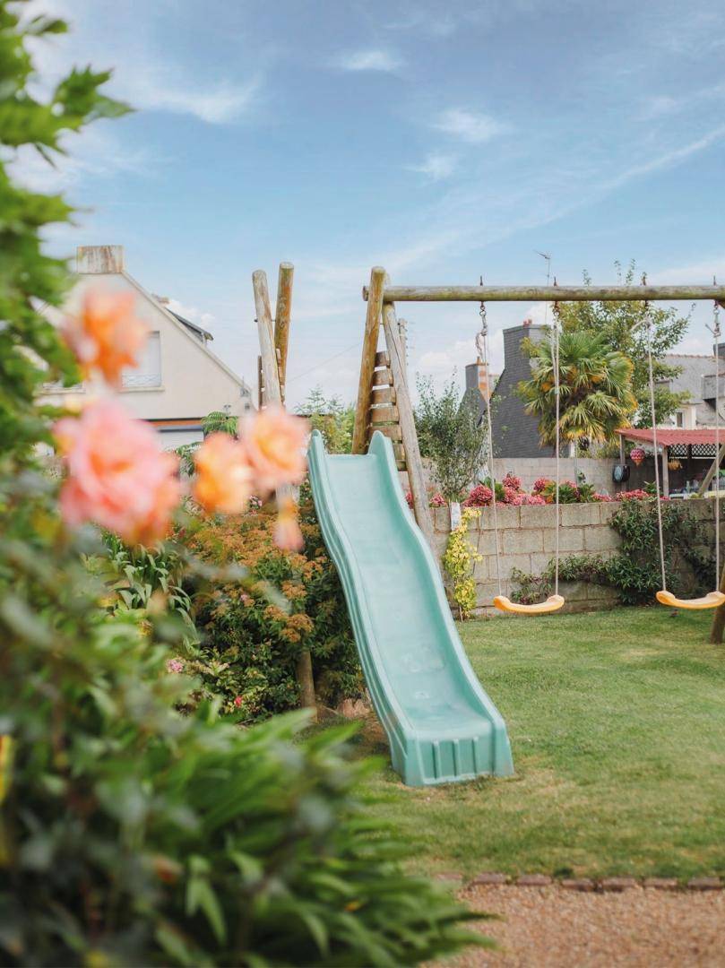 Kiesterrasse von 9 m², großer Garten von 500 m² ausgestattet mit einer Kinderschaukel inklusive Schaukel und Rutsche. Parkplätze stehen auf der Straße zur Verfügung. Der Keller des Hauses bietet Stauraum für Fahrräder und Wassersportausrüstung. In diesem Bereich stehen Ihnen auch eine Tischtennisplatte und Tischfußball zur Verfügung.