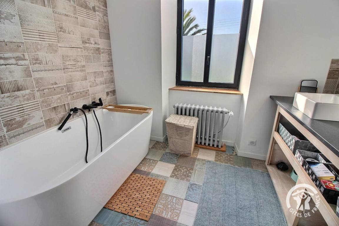 • Ein Badezimmer mit Badewanne.