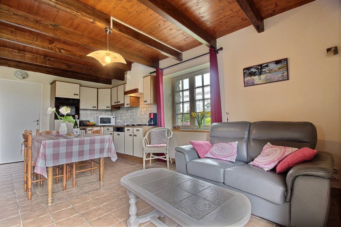 Ihre Ferienwohnung umfasst im Erdgeschoss: Wohnzimmer mit Küchenbereich, Sitzecke, WC. Etage: 2 Schlafzimmer (1 Doppelbett 140x190, 1 Einzelbett 90x190, 1 Babybett), Badezimmer mit Badewanne und WC. Großer Innenhof, Rasenfläche (500m²). Konservativer Kühlschrank. Wäschetrockner, der von den 3 Gîtes gemeinsam genutzt wird. Südlage.