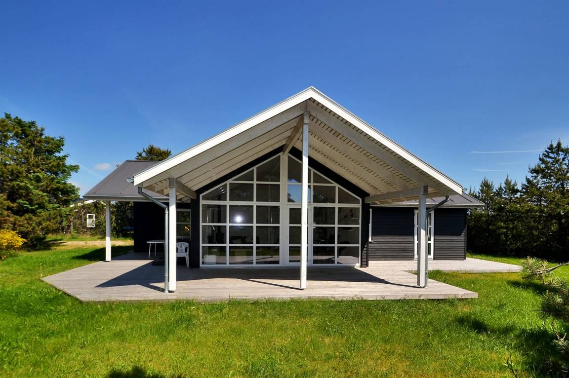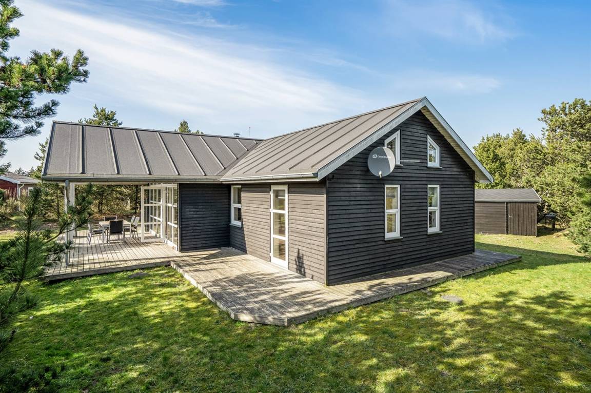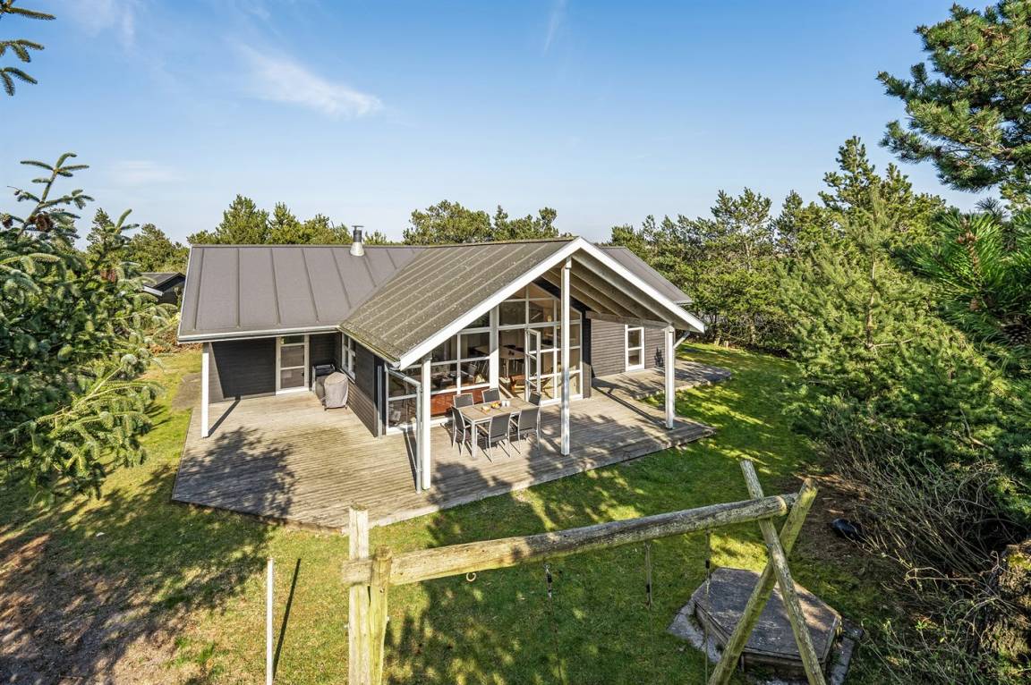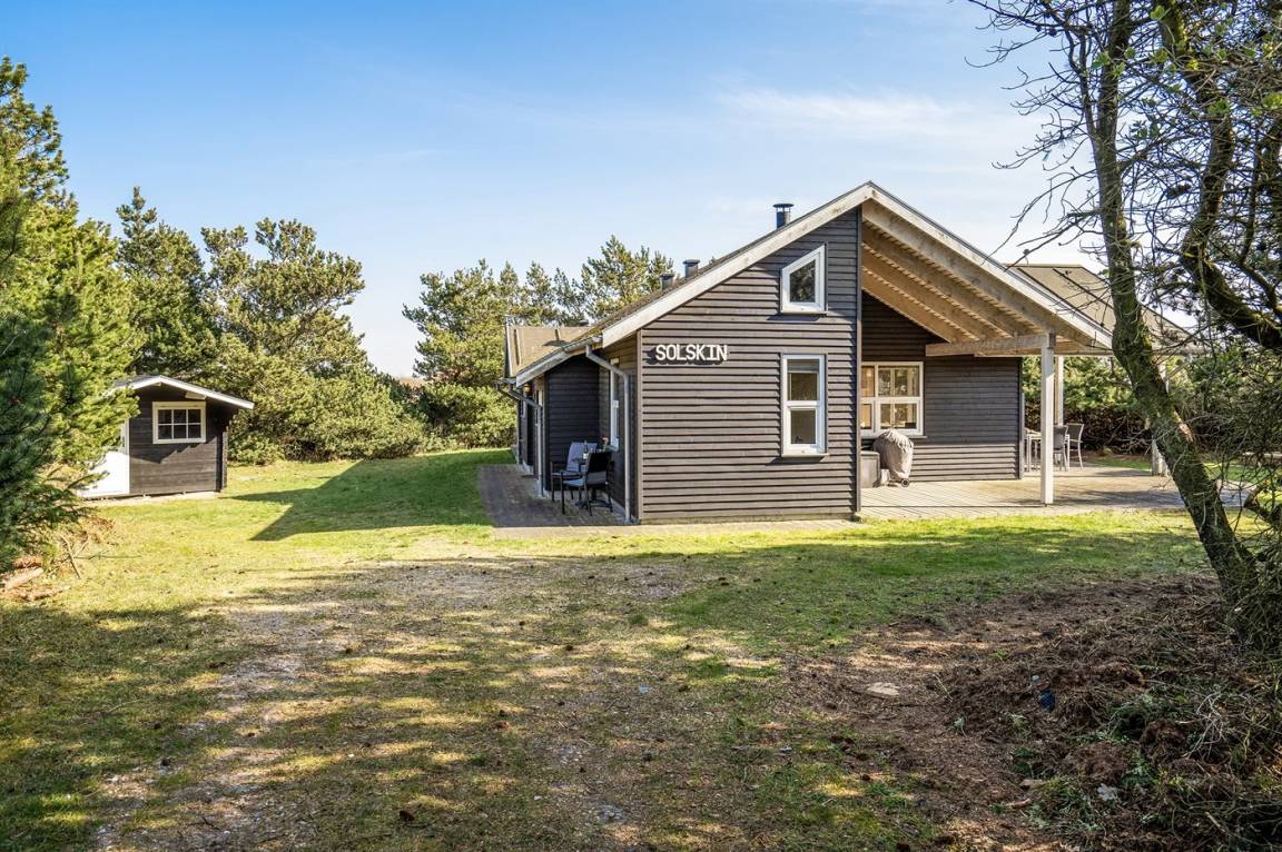 Dieses schöne Ferienhaus aus Holz liegt auf einem großen, von Kiefern umgebenen Naturgrundstück – nur 100 m vom Strand entfernt.