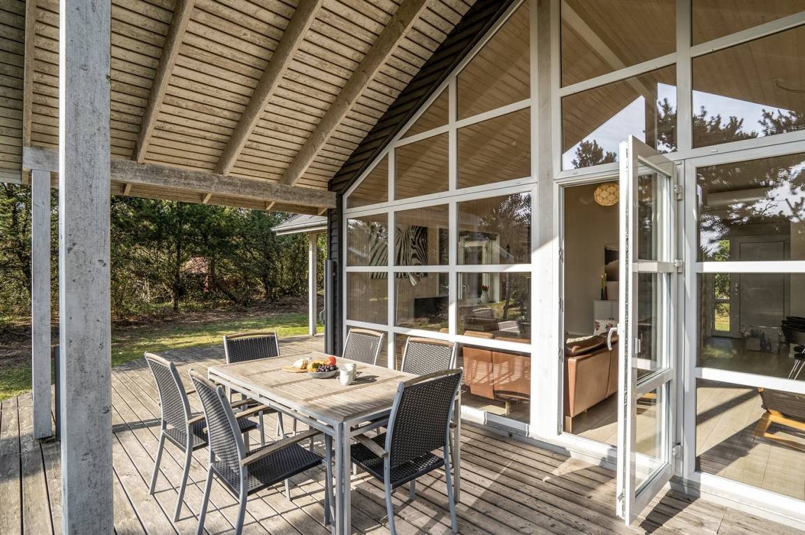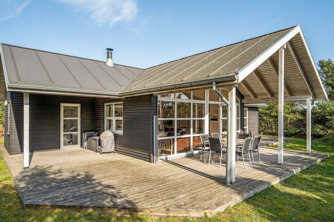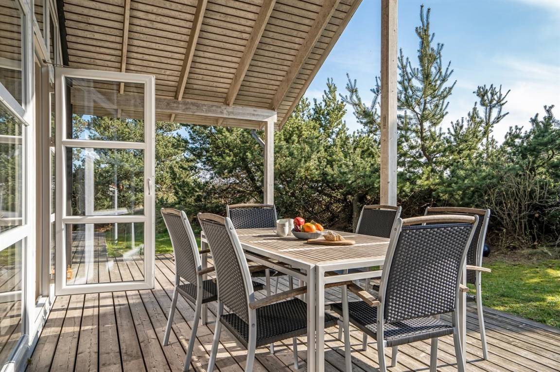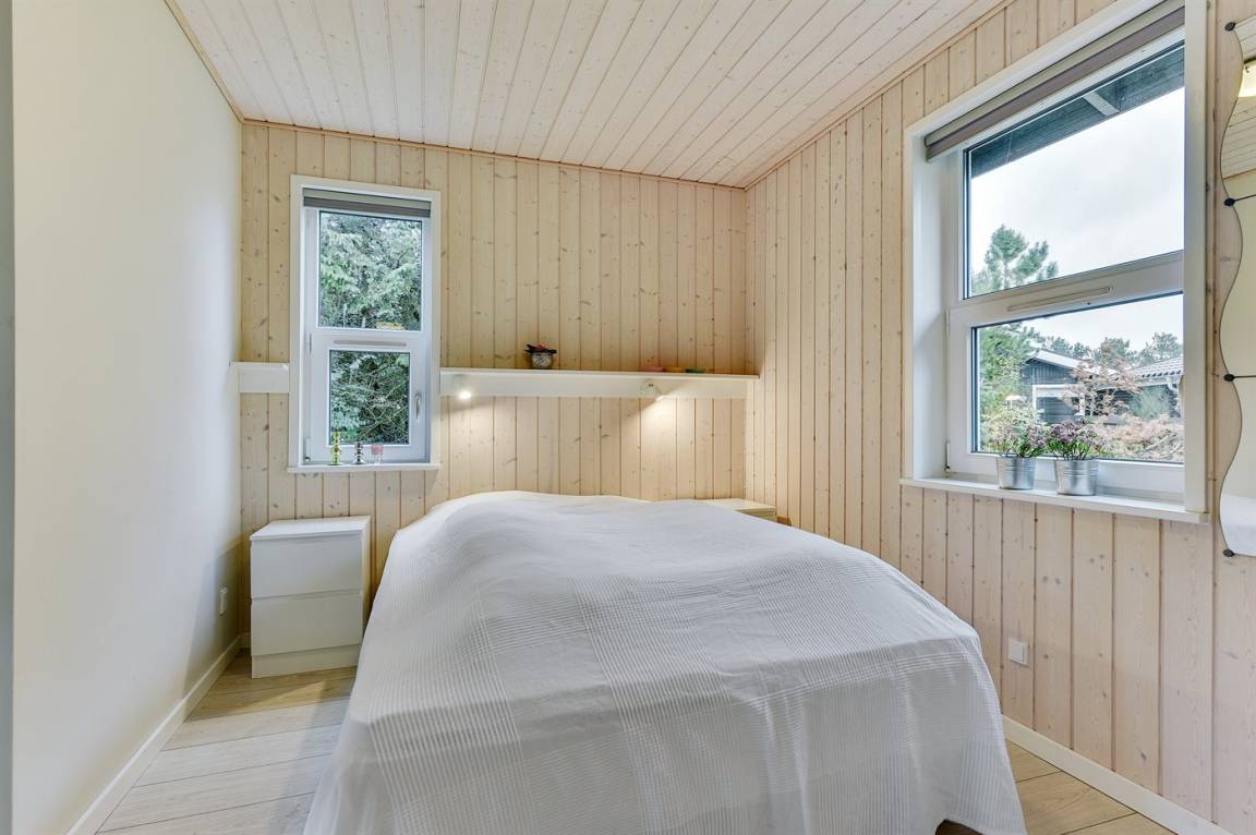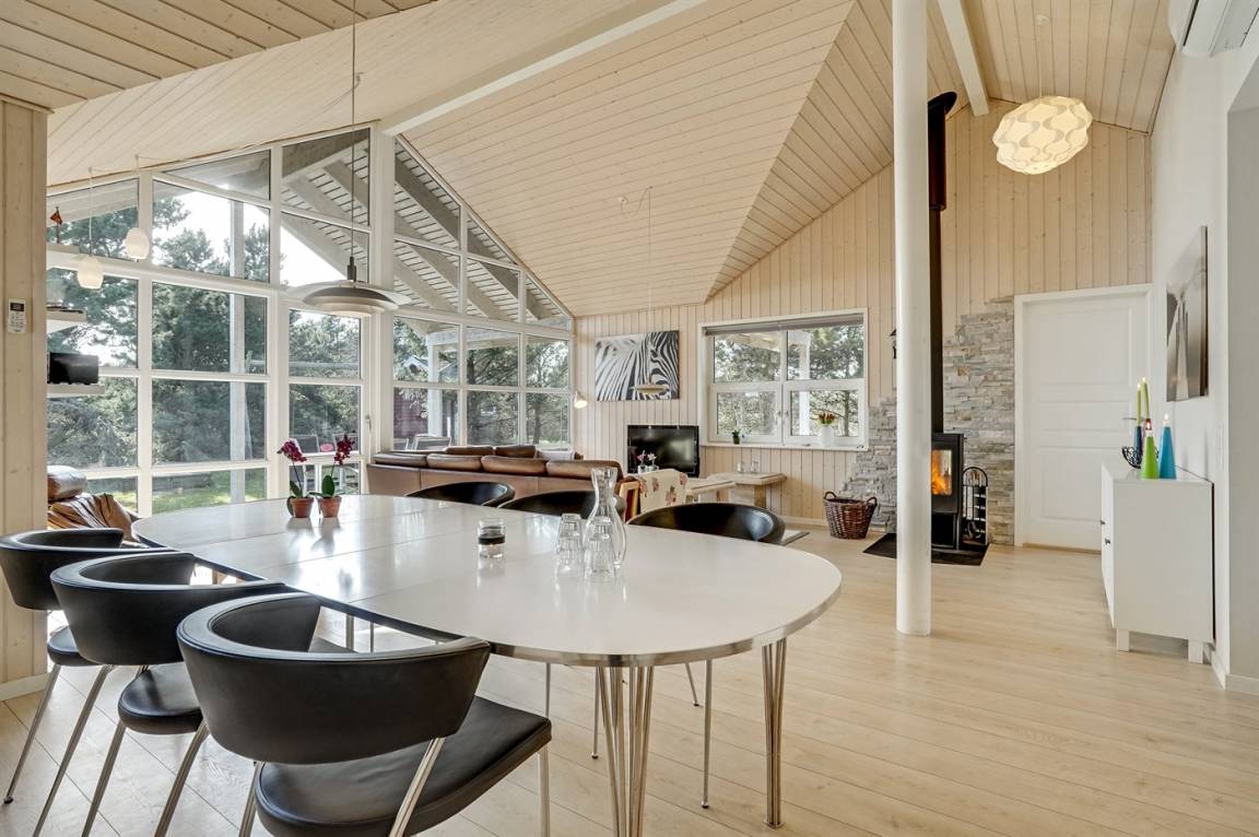 Dieses schöne Ferienhaus aus Holz liegt auf einem großen, von Kiefern umgebenen Naturgrundstück – nur 100 m vom Strand entfernt.