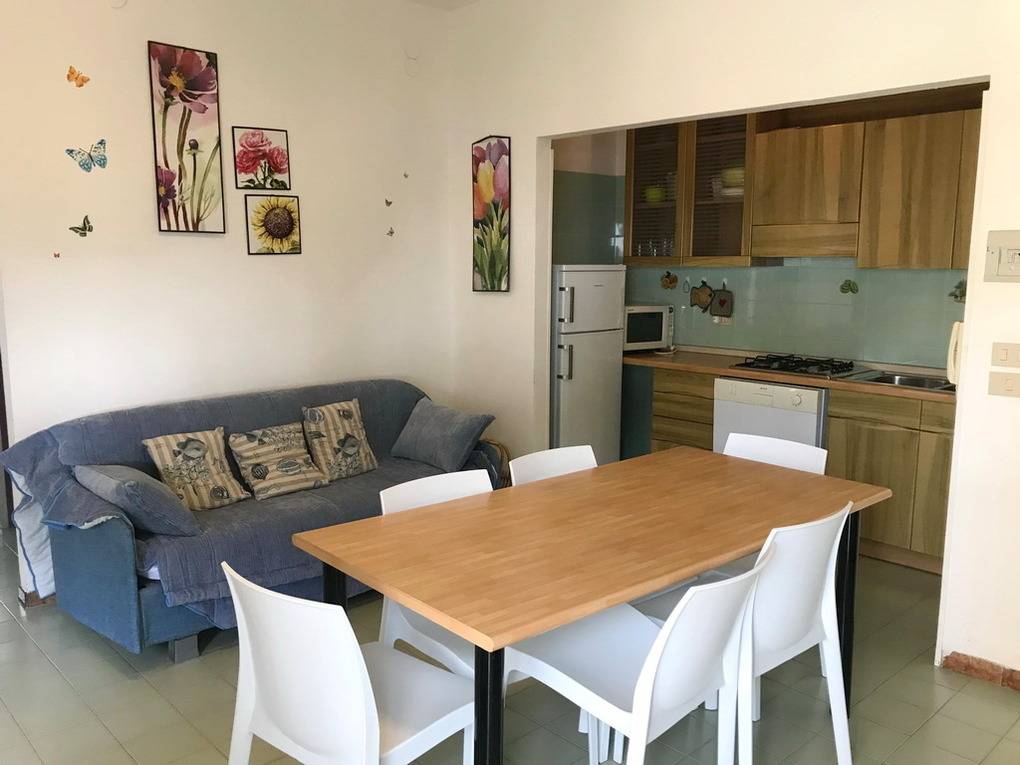 Die Ferienwohnung ist im ersten Stock gelegen und bietet eine günstige strategische Lage mit Meerblick. Sie verfügt über eine nach Südwesten ausgerichtete Terrasse. Der Innenbereich ist geräumig und umfasst zwei komfortable Schlafzimmer, jeweils mit 3 Betten, sowie ein vollständiges Badezimmer und eine Waschküche mit Waschbecken und zweiter Dusche. Im Wohnzimmer befindet sich ein bequemes Doppelschlafsofa. Die Küchenzeile ist mit verschiedenen Geräten wie einem Geschirrspüler, einer Mikrowelle, einem Kühlschrank mit Handy, einem LED-TV und einer Klimaanlage ausgestattet.
