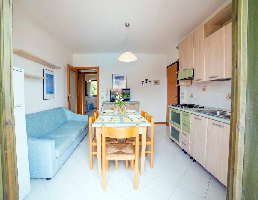 Die Appartements in Porto Sole sind wie folgt aufgeteilt: Es gibt 3-Zimmer-Appartements für maximal 4 bis 5 Personen. Diese verfügen über ein Schlafzimmer mit einem Doppelbett und einem Zustellbett, ein weiteres Schlafzimmer mit entweder zwei Einzelbetten oder einem Stockbett, einen Wohnraum mit Küchenzeile (in den meisten Fällen mit Spülmaschine), ein Badezimmer mit Dusche und WC sowie einen Balkon mit Gartenmöbeln.