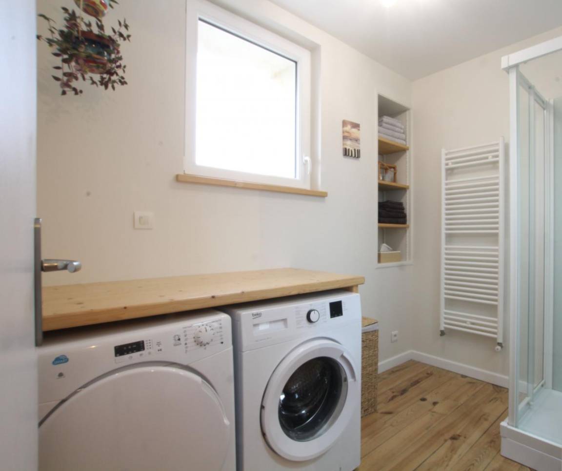 Doppelhaushälfte. Im Erdgeschoss: Wohnzimmer mit Holzofen (Schlafsofa, TV, WLAN-Internetzugang, DVD-Player). Offene, voll ausgestattete Küche (Mikrowelle, Geschirrspüler, Elektroherd, Gasherd, Kühl-Gefrierkombination). WC. Obergeschoss: Schlafzimmer 1 (2 Einzelbetten à 90x190). Schlafzimmer 2 (1 Bett à 140x190). Duschraum (Dusche, Waschmaschine und Trockner). WC. Draußen, privater Innenhof, gesichert durch ein elektrisches Tor. Eingezäunter Garten. Picknicktisch. Liegestühle. Grill. Überdachter Unterstand. Gaszentralheizung. Holz vorhanden. Alle Nebenkosten inklusive. Bettwäsche, Handtücher und Haushaltswäsche werden gestellt. Reinigungsservice gegen Aufpreis.